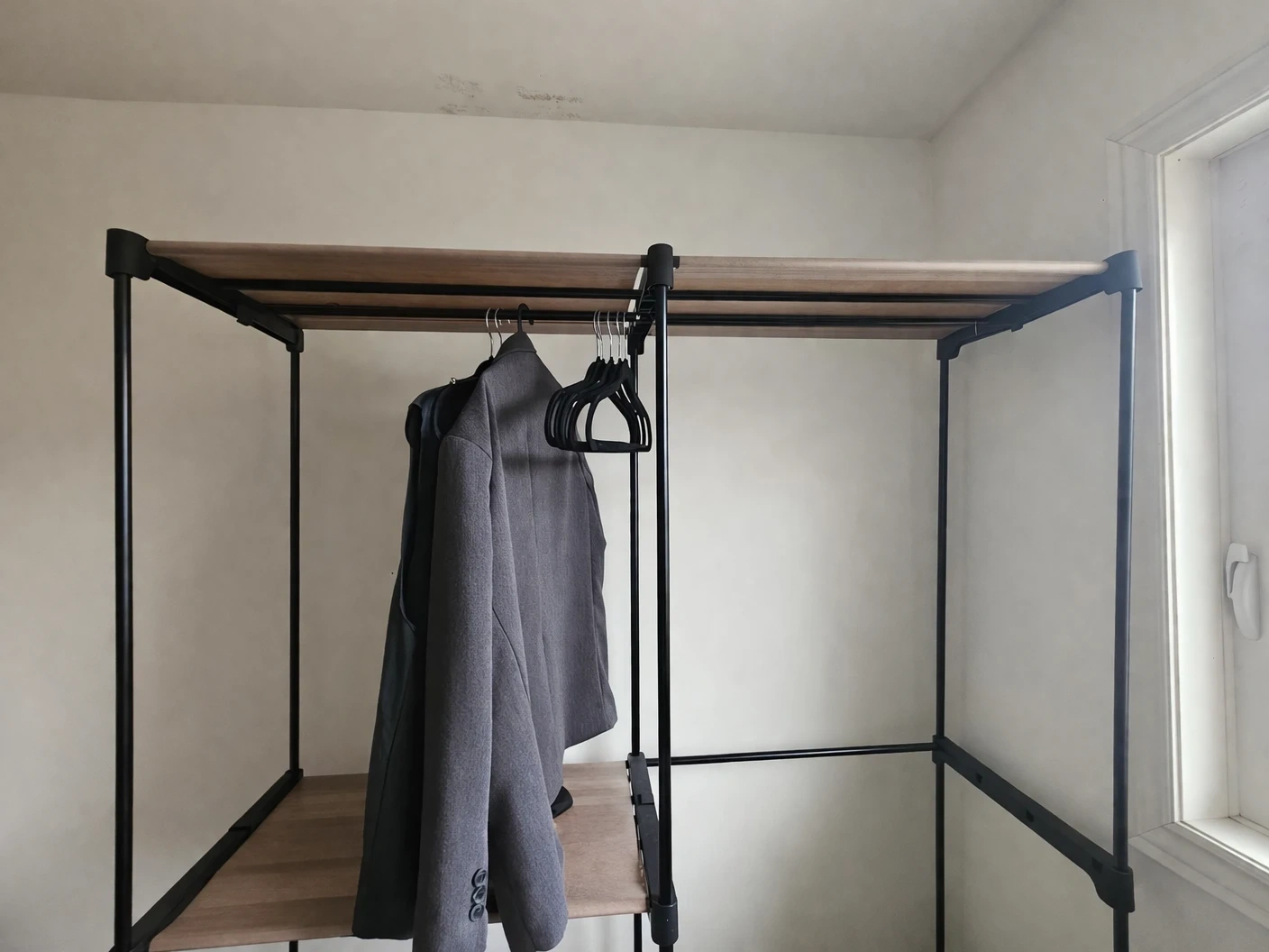 This portable clothing rack offers a convenient way to store your garments. It's constructed with a metal frame and wood-effect shelves. Perfect for keeping clothes organized in a bedroom or closet space.