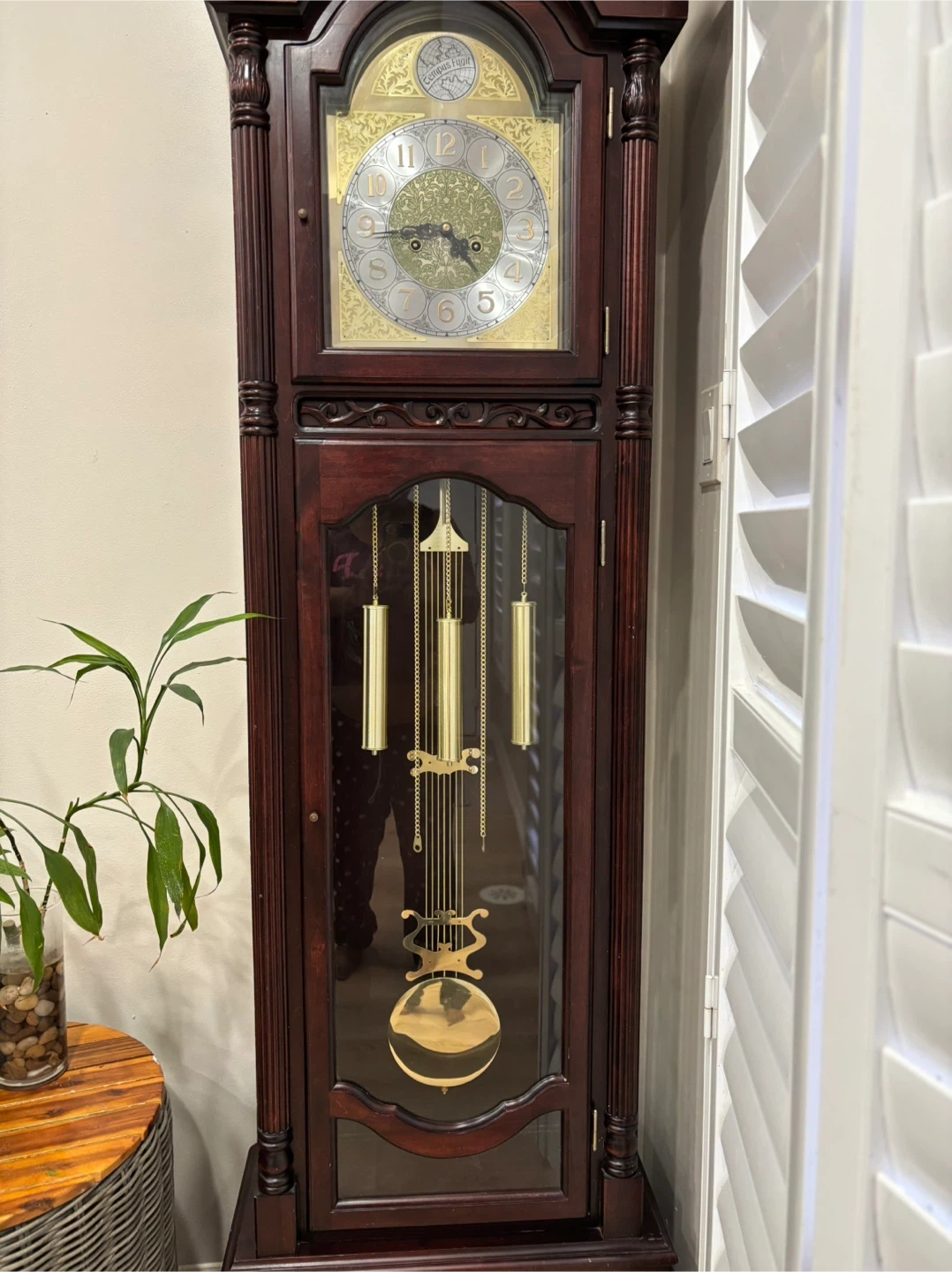 Selling a beautiful Tempus Fugit grandfather clock. It's a lovely dark wood and would be a great addition to any home. The clock features a classic design with a pendulum and weights.