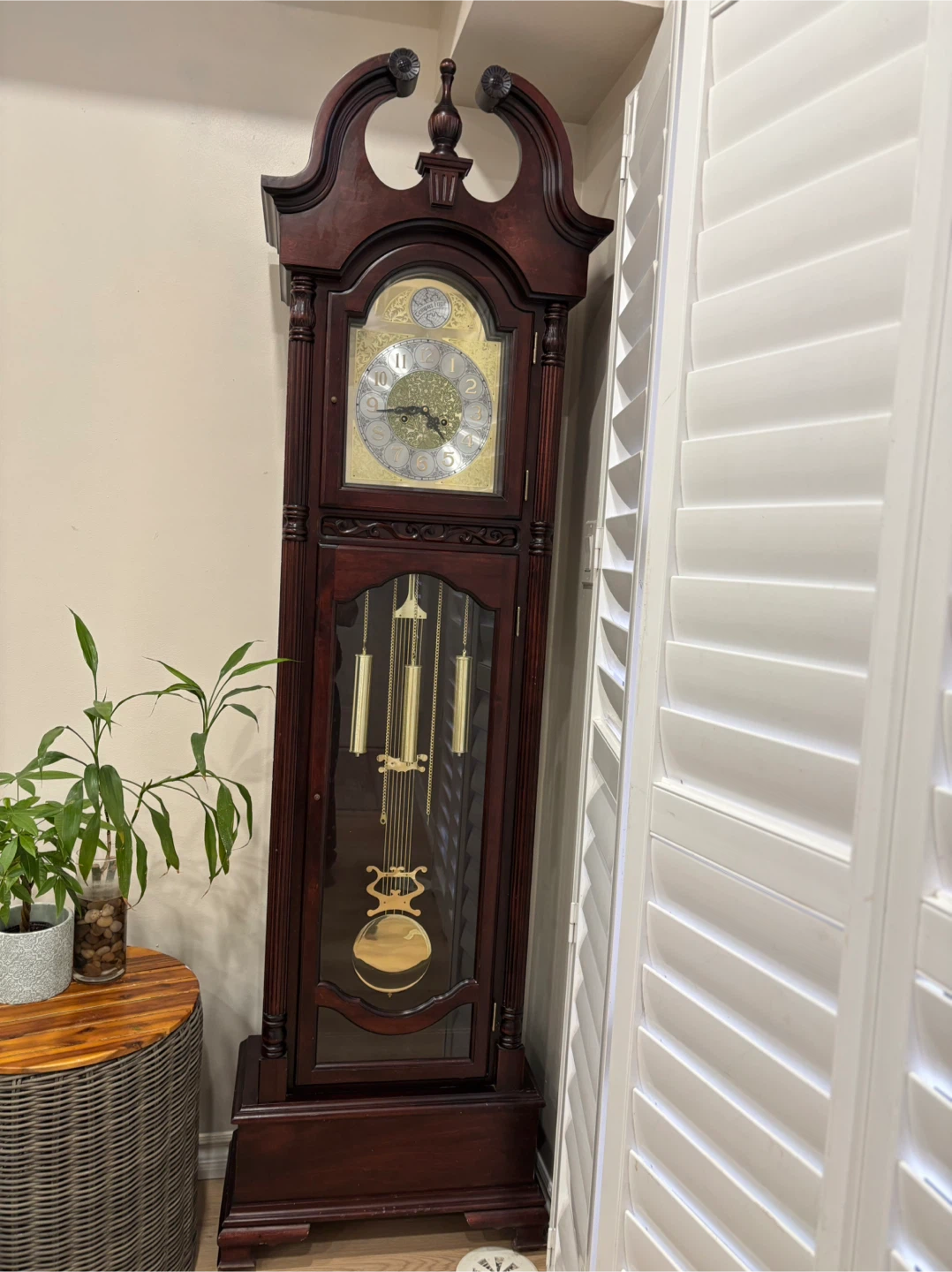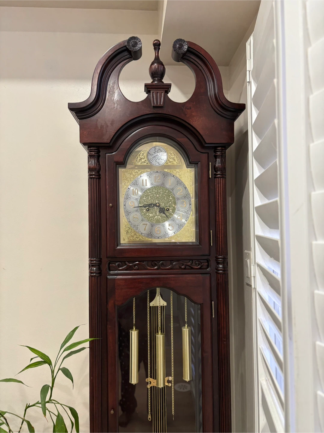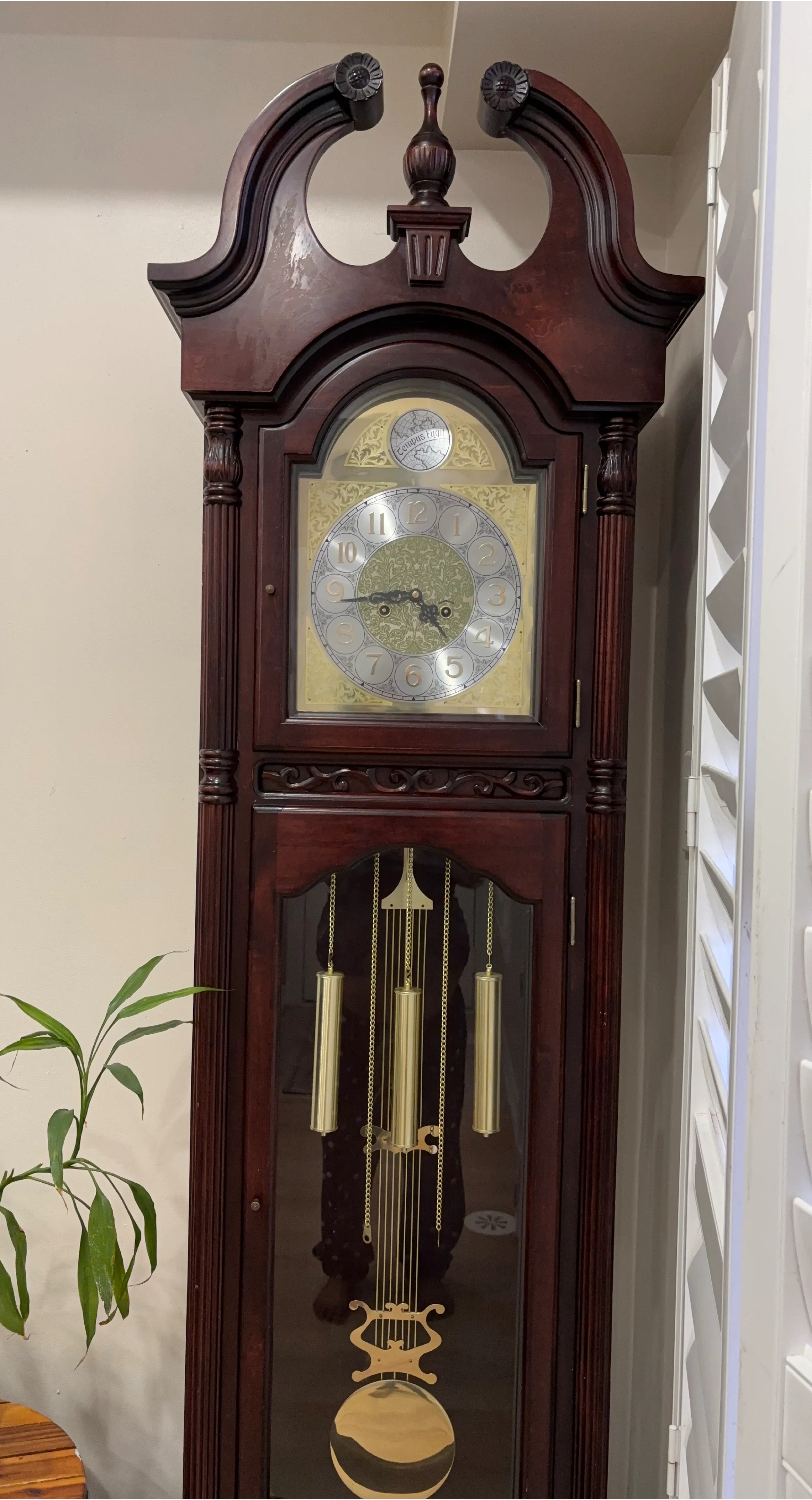 Selling a beautiful Tempus Fugit grandfather clock. It's a lovely dark wood and would be a great addition to any home. The clock features a classic design with a pendulum and weights.