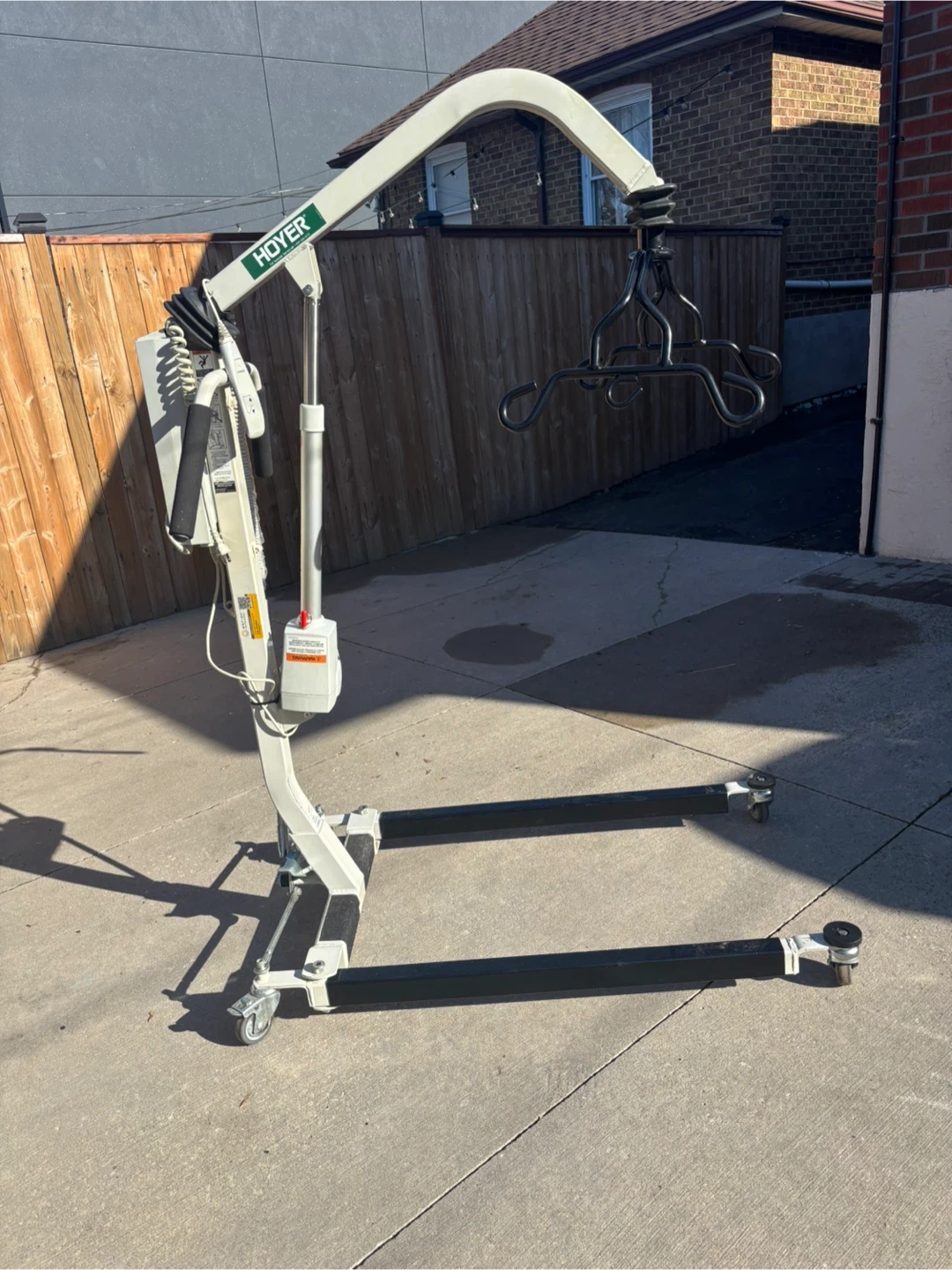 This is a Hoyer patient lift. It's designed to assist with patient transfers. Features include adjustable legs and a manual pump for lifting.