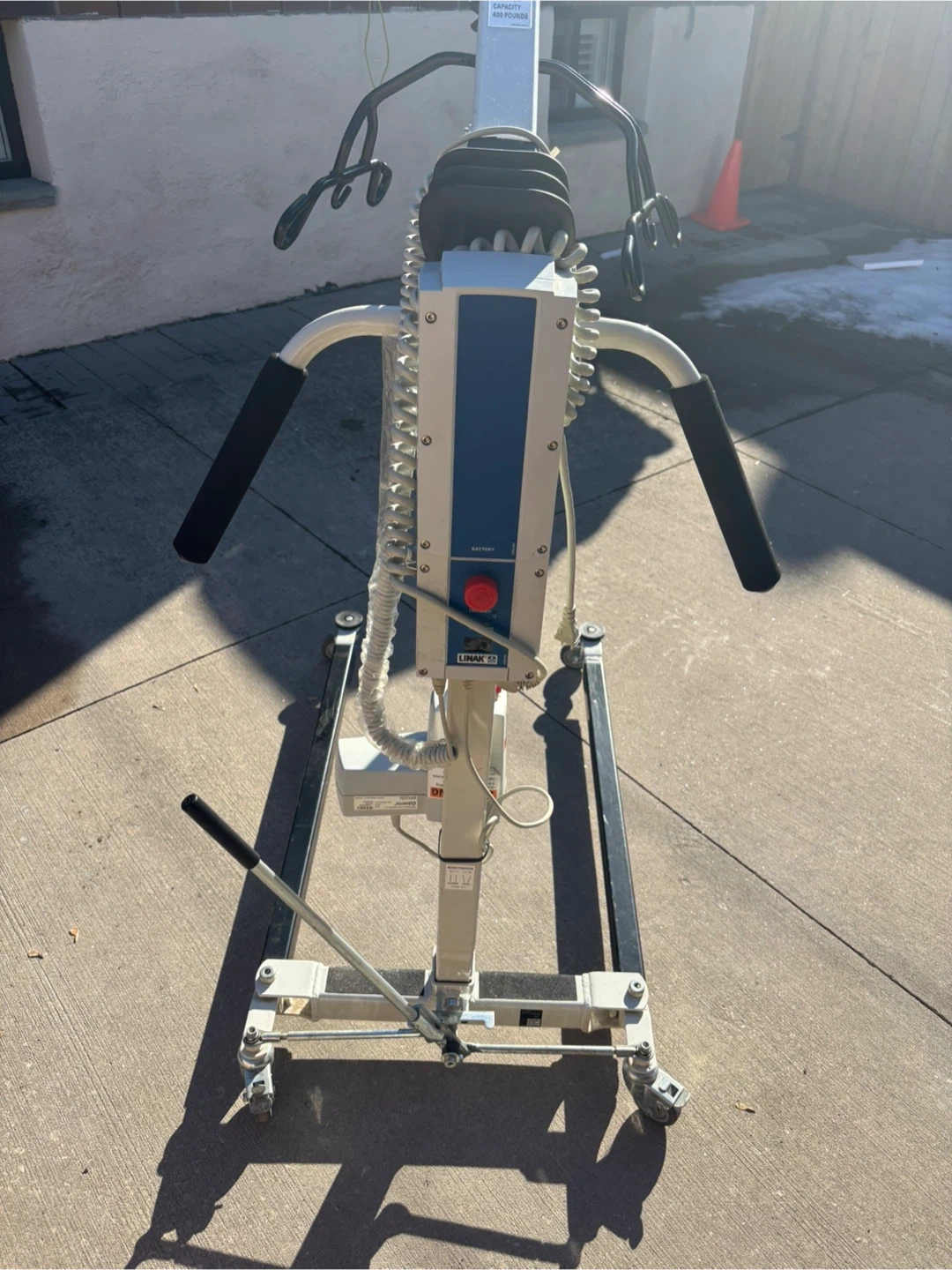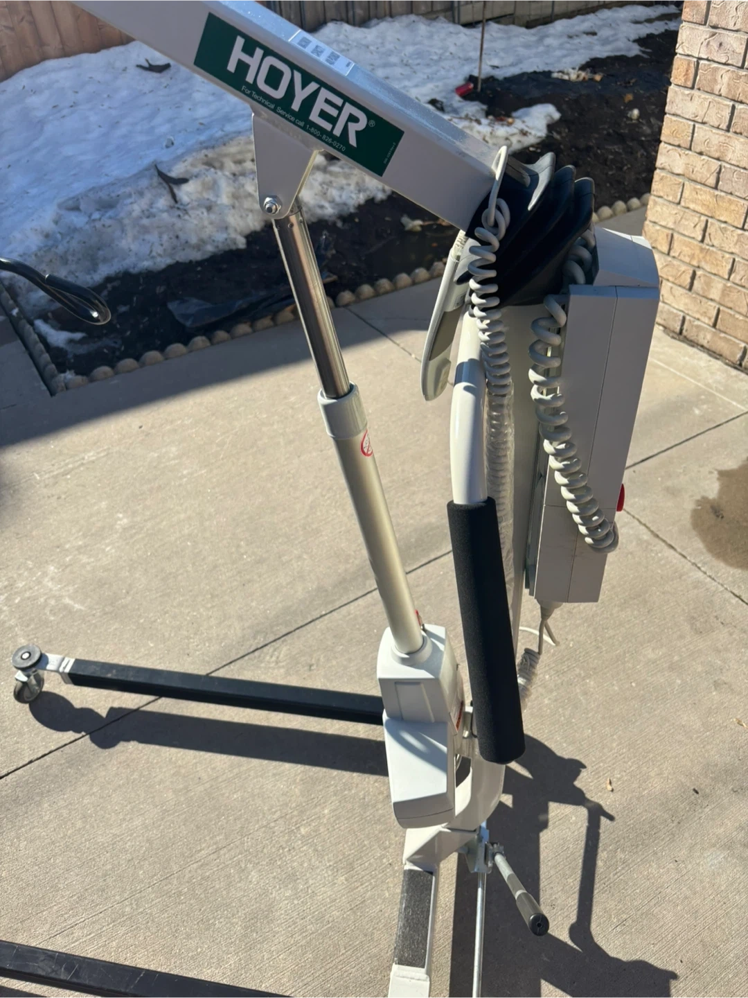 This is a Hoyer patient lift. It's designed to assist with patient transfers. Features include adjustable legs and a manual pump for lifting.