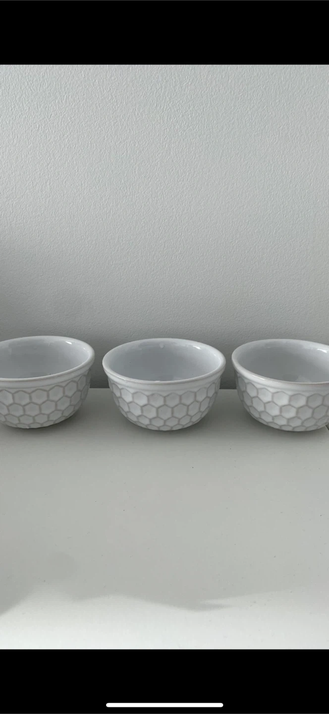 Selling a set of three cute little bowls from House & Home! They feature a unique honeycomb pattern and are in great condition. Perfect for dips, snacks, or even as small decorative pieces for your home.