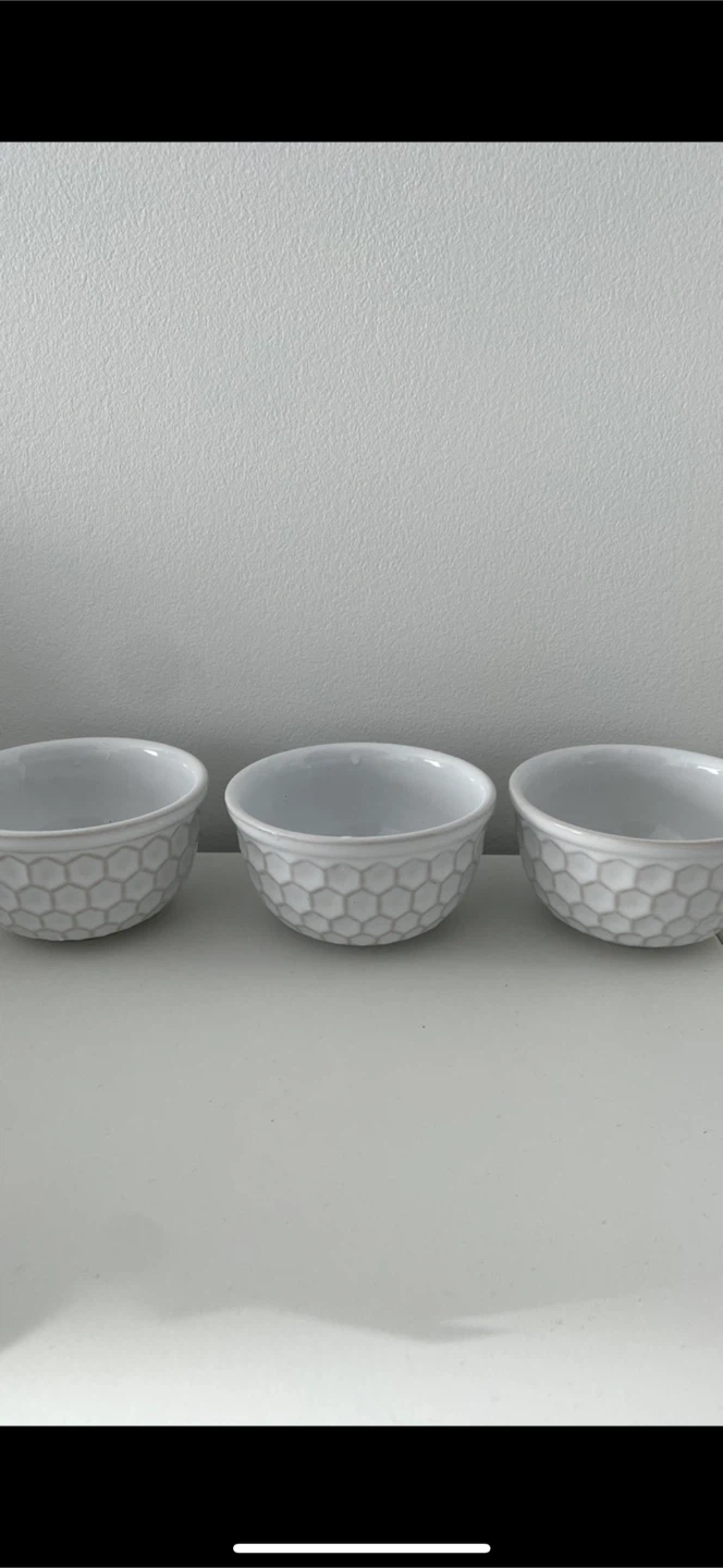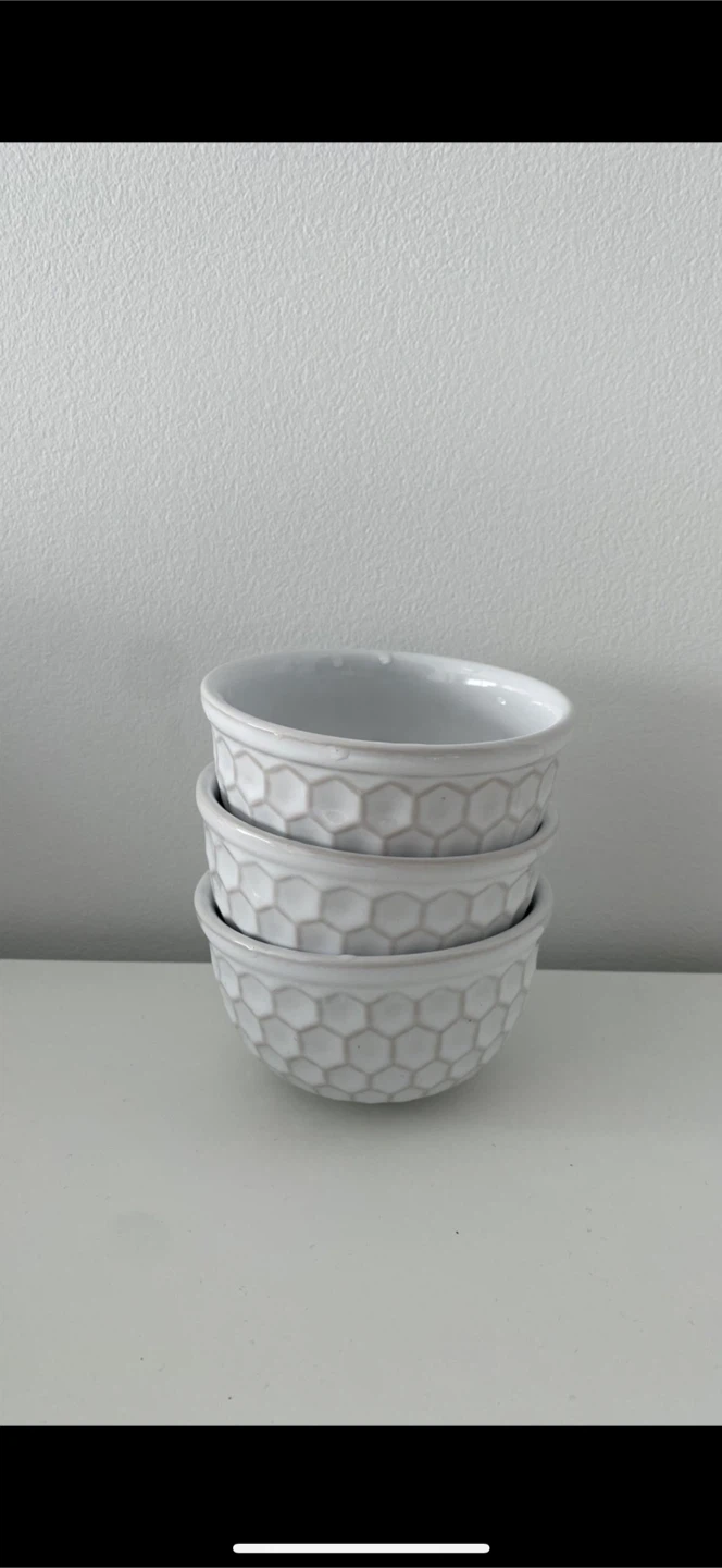 Selling a set of three cute little bowls from House & Home! They feature a unique honeycomb pattern and are in great condition. Perfect for dips, snacks, or even as small decorative pieces for your home.