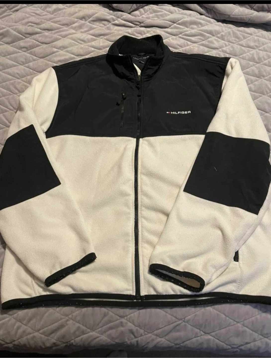 This is a Tommy Hilfiger zip-up fleece jacket in black and cream. It's a size XXL. Keeps you warm on chilly days!