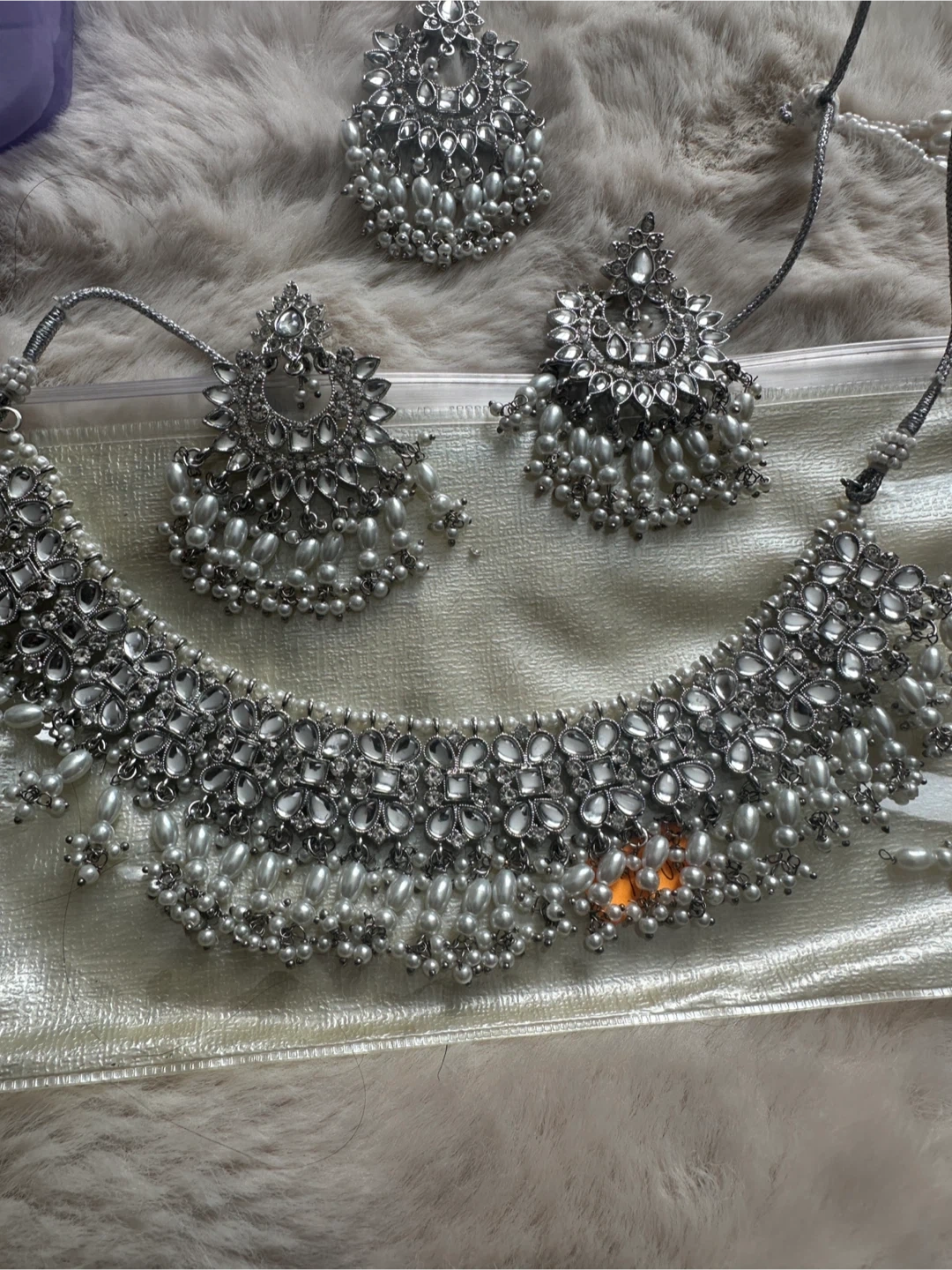 This is a beautiful choker necklace and matching earrings set. It's adorned with faux pearls and intricate silver-toned detailing. This set would add a lovely touch to ethnic wear!