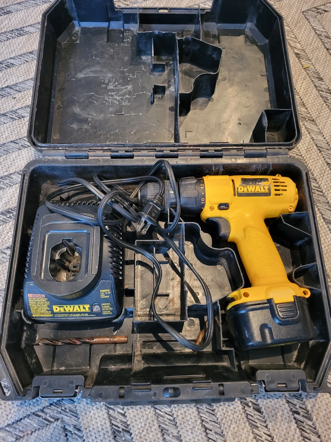Yellow DeWalt cordless drill and charger included. It comes with one drill bit and its original case. This tool is ready for your projects!