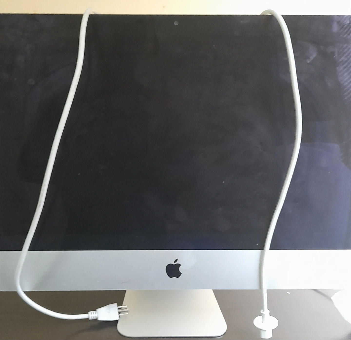 This is an Apple iMac all-in-one computer. It's a silver desktop computer with a black screen and a stand. Includes a white power cord.