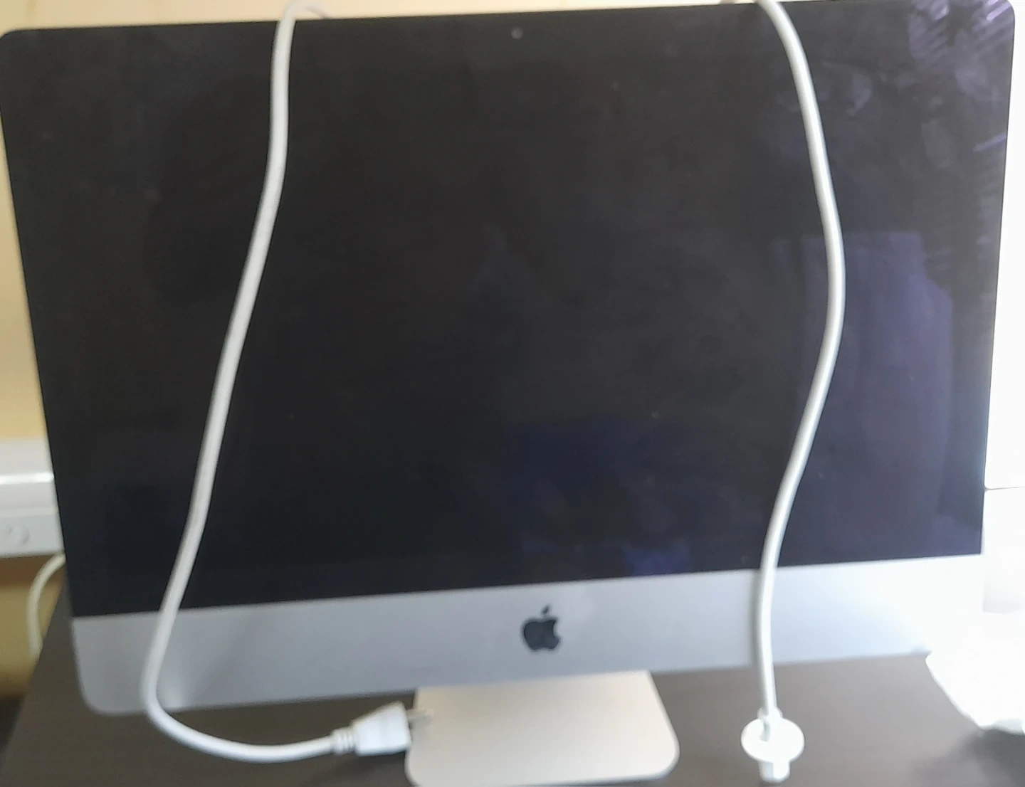 This is an Apple iMac all-in-one computer. It's a silver desktop computer with a black screen and a stand. Includes a white power cord.
