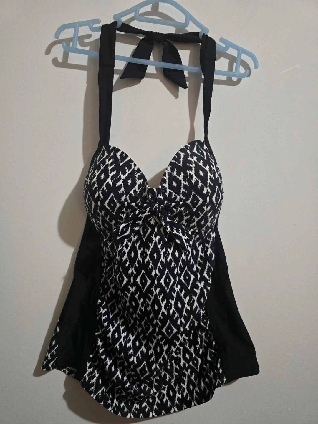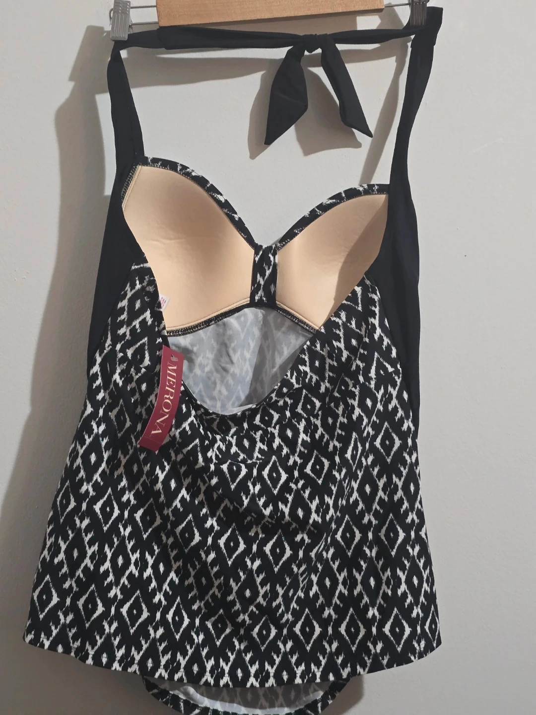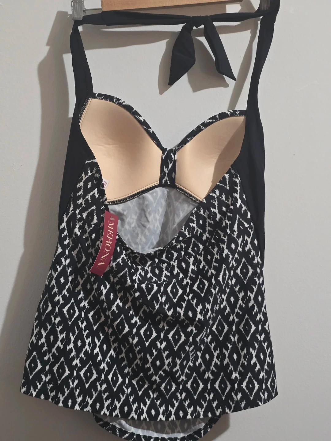 Stay stylish and comfortable at the beach or pool with this beautiful Merona tankini top. This piece is New with Tags (NWT) and features a classic black and white geometric ikat pattern that is both modern and flattering.