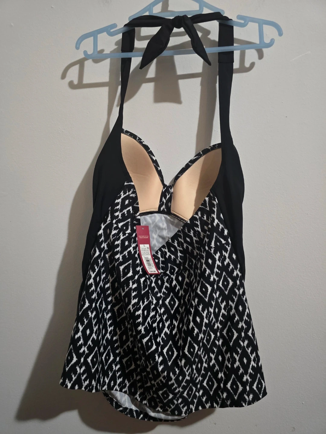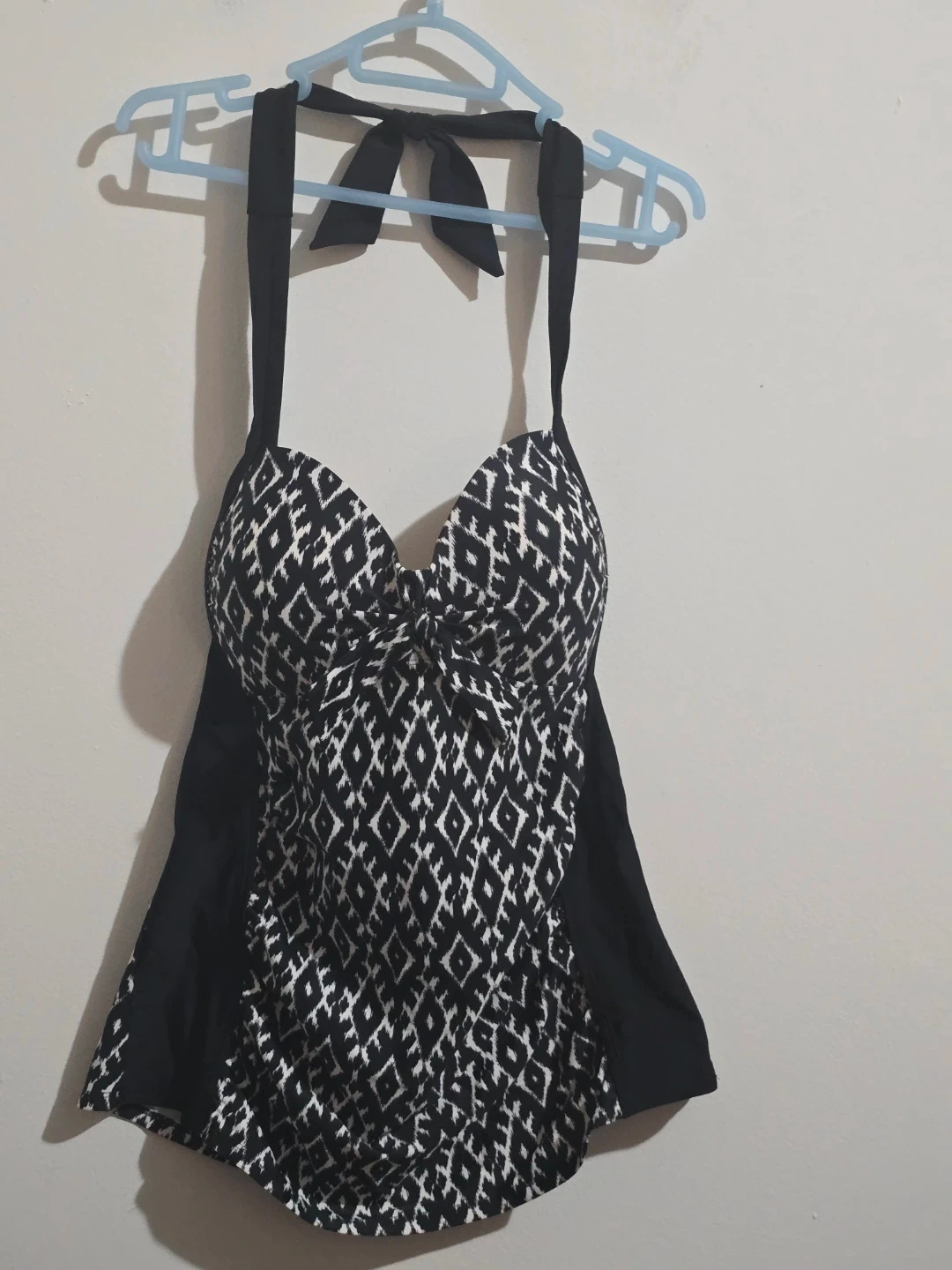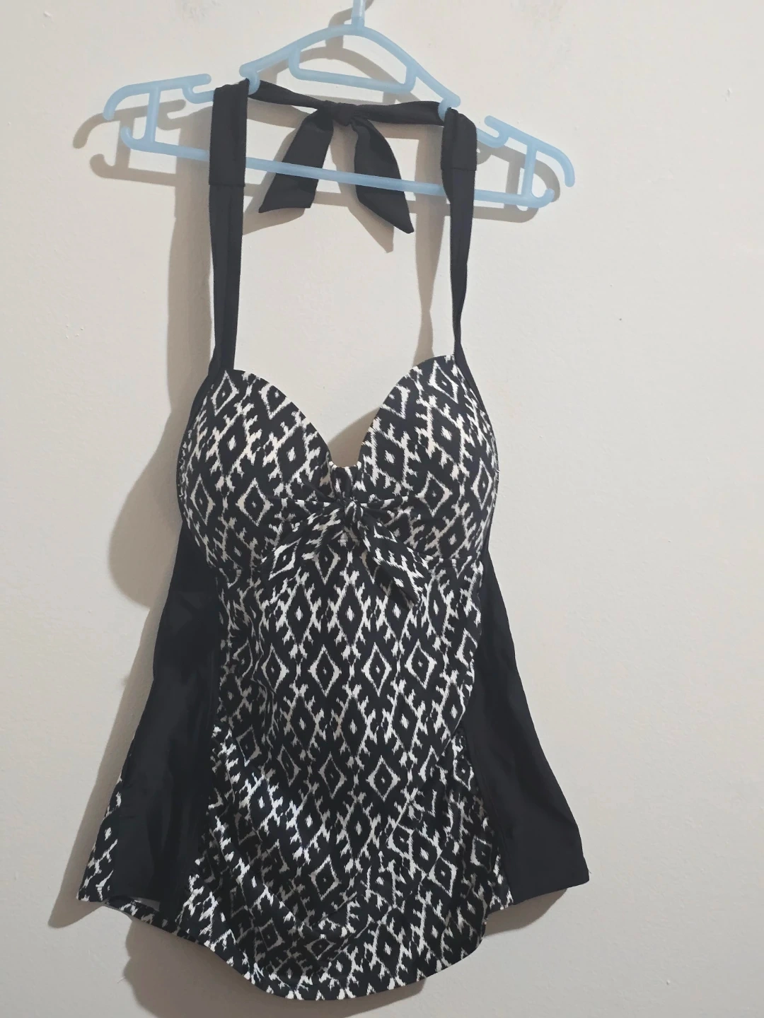 Stay stylish and comfortable at the beach or pool with this beautiful Merona tankini top. This piece is New with Tags (NWT) and features a classic black and white geometric ikat pattern that is both modern and flattering.
