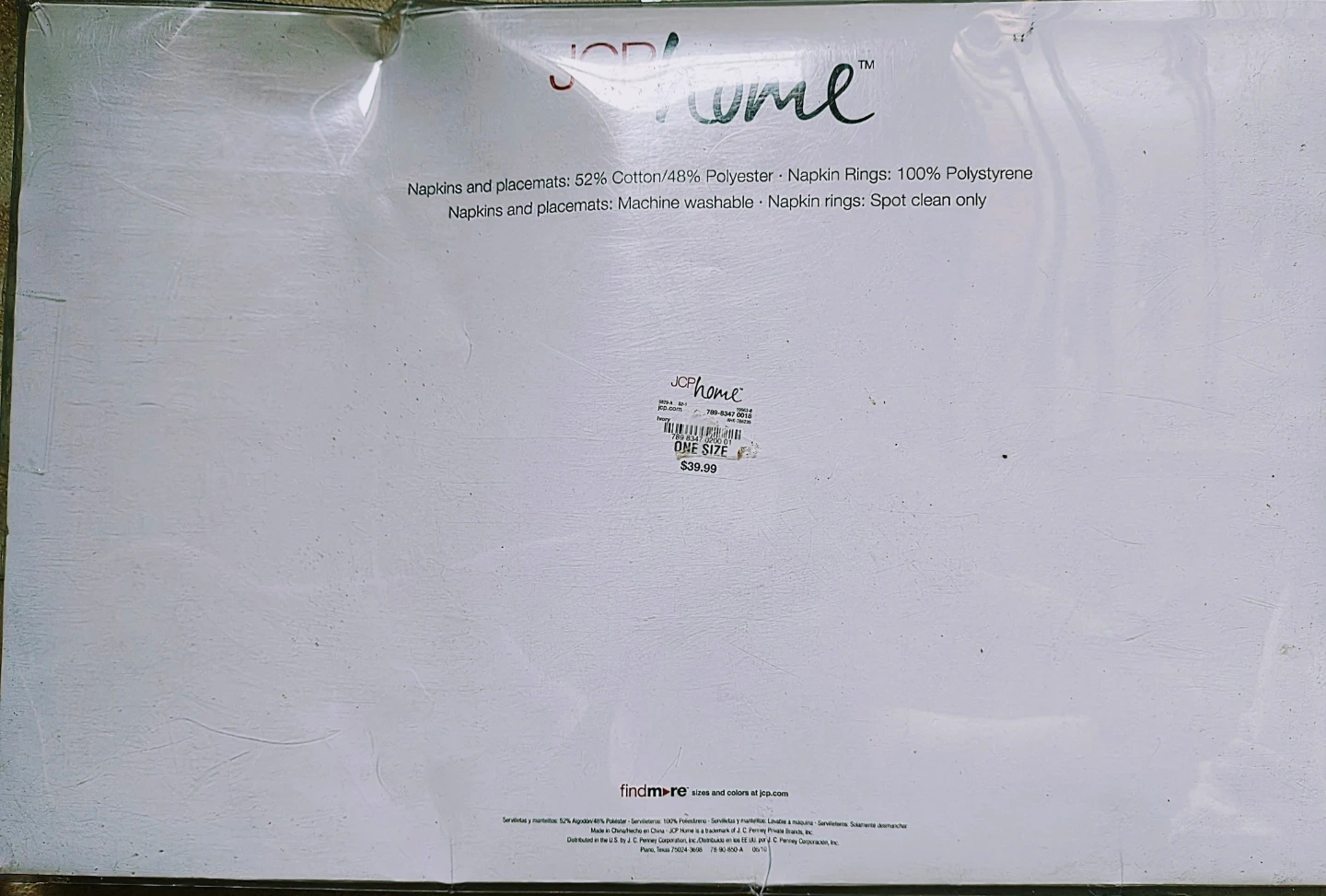 This JCP home set includes 6 placemats, 6 napkins, and 6 napkin rings. Napkins and placemats are 52% Cotton/48% Polyester. Napkin rings are 100% Polystyrene. Machine washable napkins and placemats. Spot clean napkin rings only.