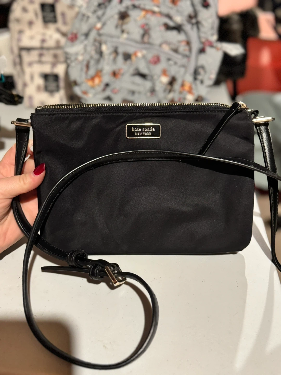 This is a black nylon Kate Spade New York crossbody bag. It has a zip closure and leather strap detailing. The material is durable nylon.
