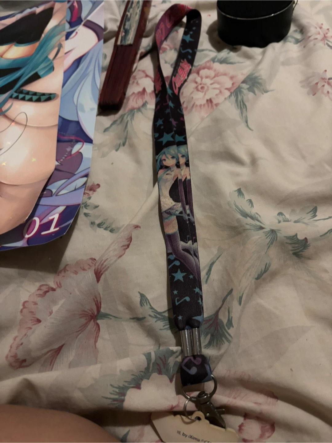 This is an anime-themed lanyard. It features characters with teal hair. The lanyard is black with blue stars and musical notes.