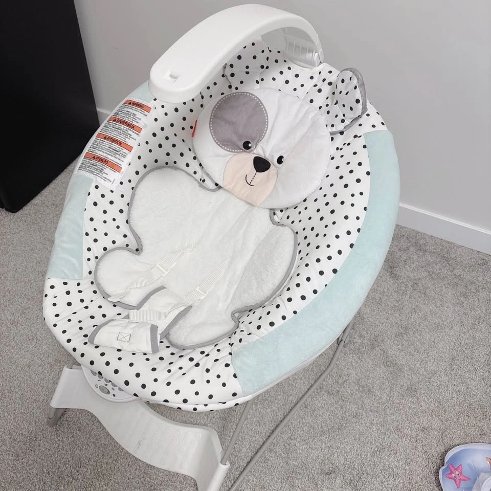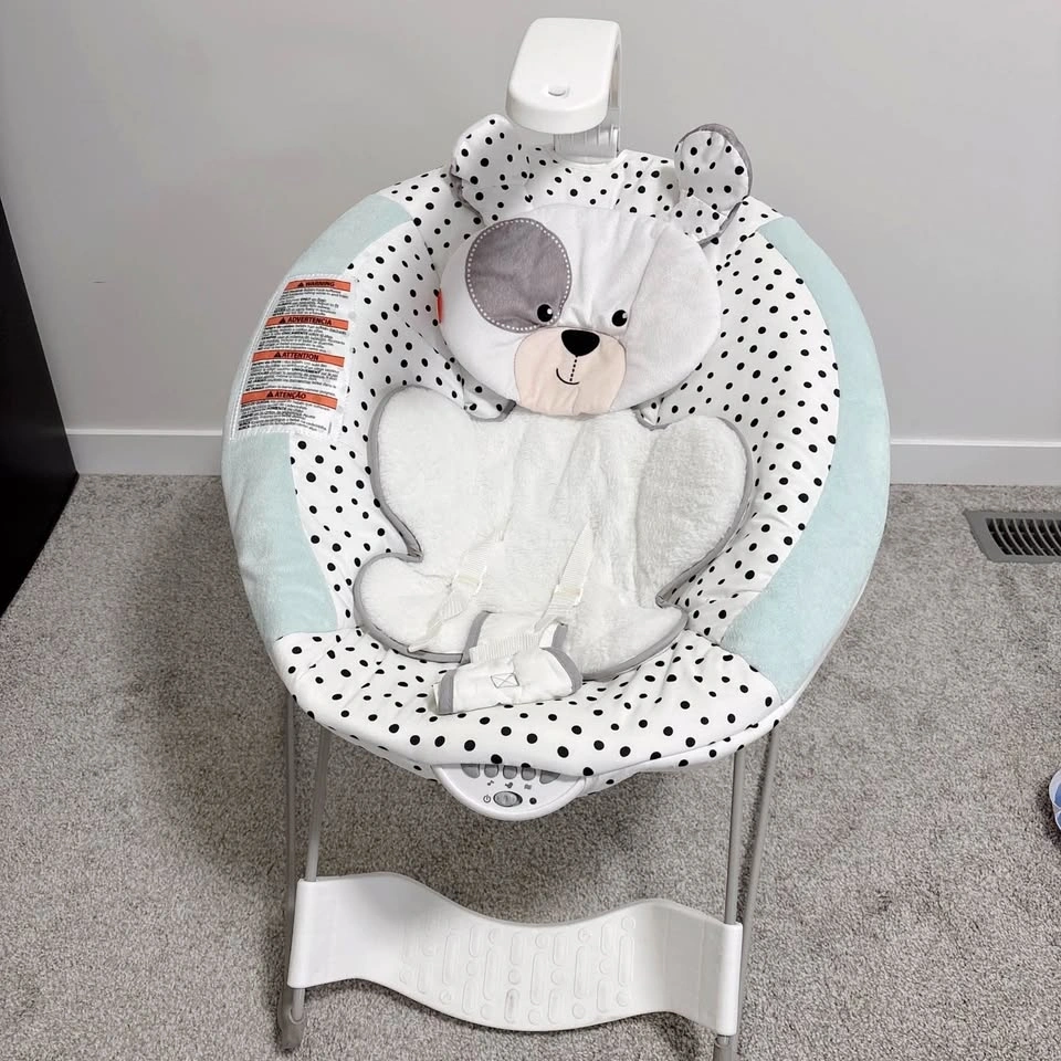 Excellent condition. Smoke free, pet free home. The seat has been washed. Features 20 minutes of music and nature sounds with volume control, and calming vibration for soothing. Includes an adjustable 3-point harness, non-skid feet, and a machine-washable puppy seat pad with an extra-plush head insert. Has a foot pedal for hands-free bouncing. Pick up in Rockland Park NW.