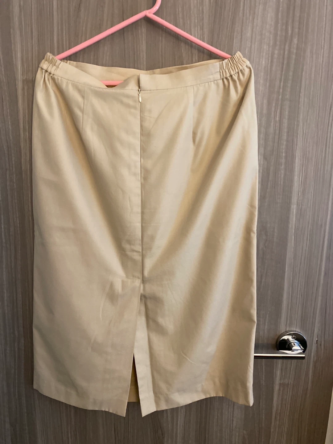 A simple beige midi skirt. It features an elastic waistband at the back and a zippered closure. The fabric appears to be a blend, offering a nice drape. This skirt is a versatile piece for various occasions.