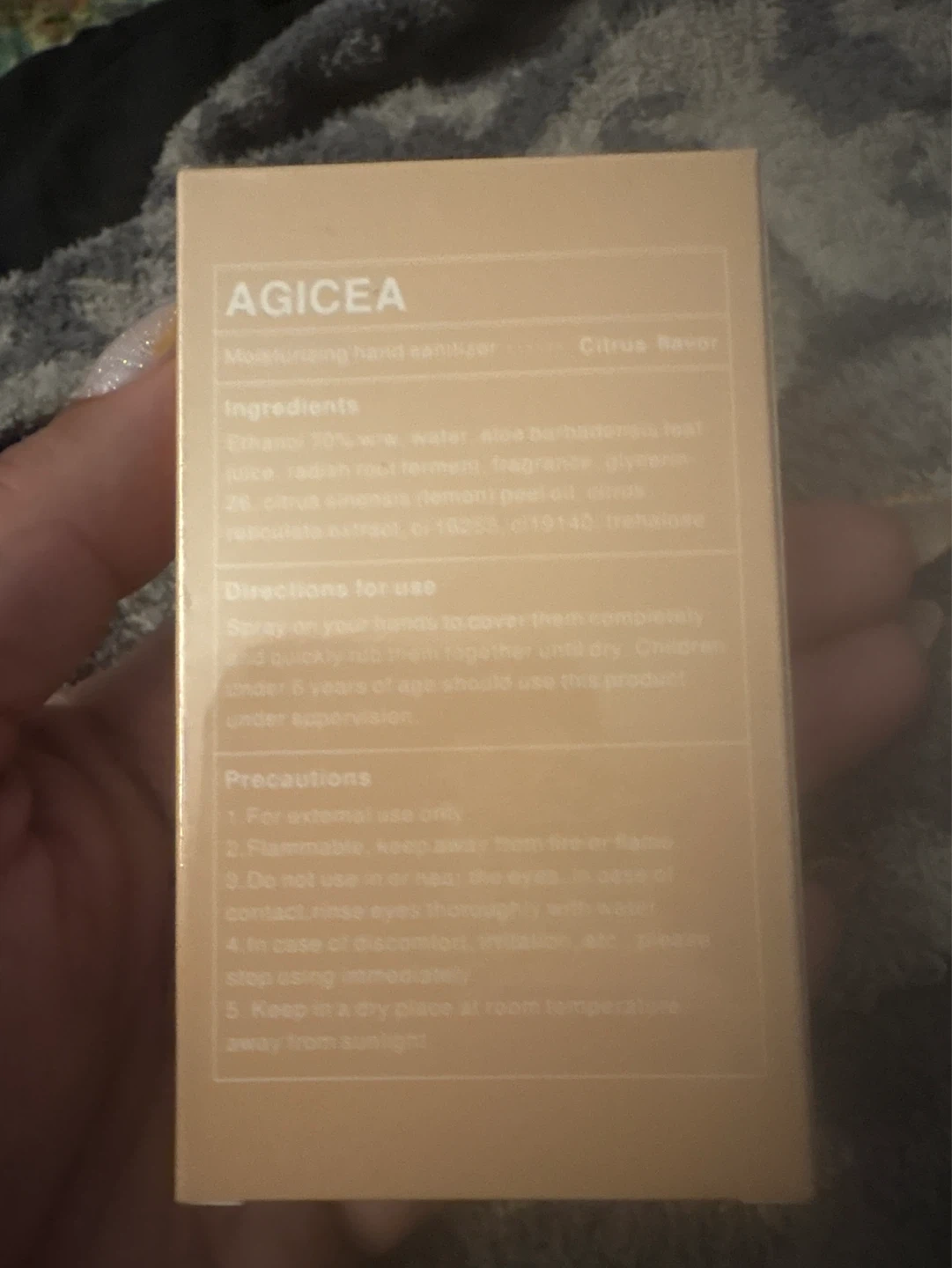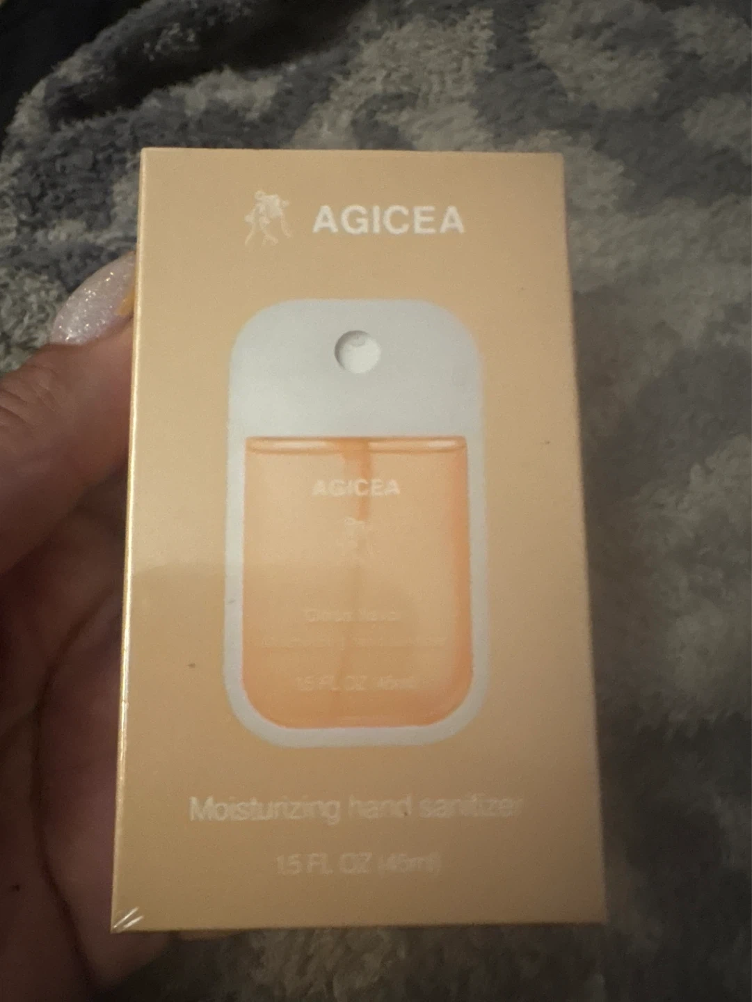 This is AGICEA moisturizing hand sanitizer in a citrus flavor. It's a 1.5 FL OZ (45ml) bottle. Contains Ethanol 70% w/w and aloe barbadensis leaf juice. For external use only.
