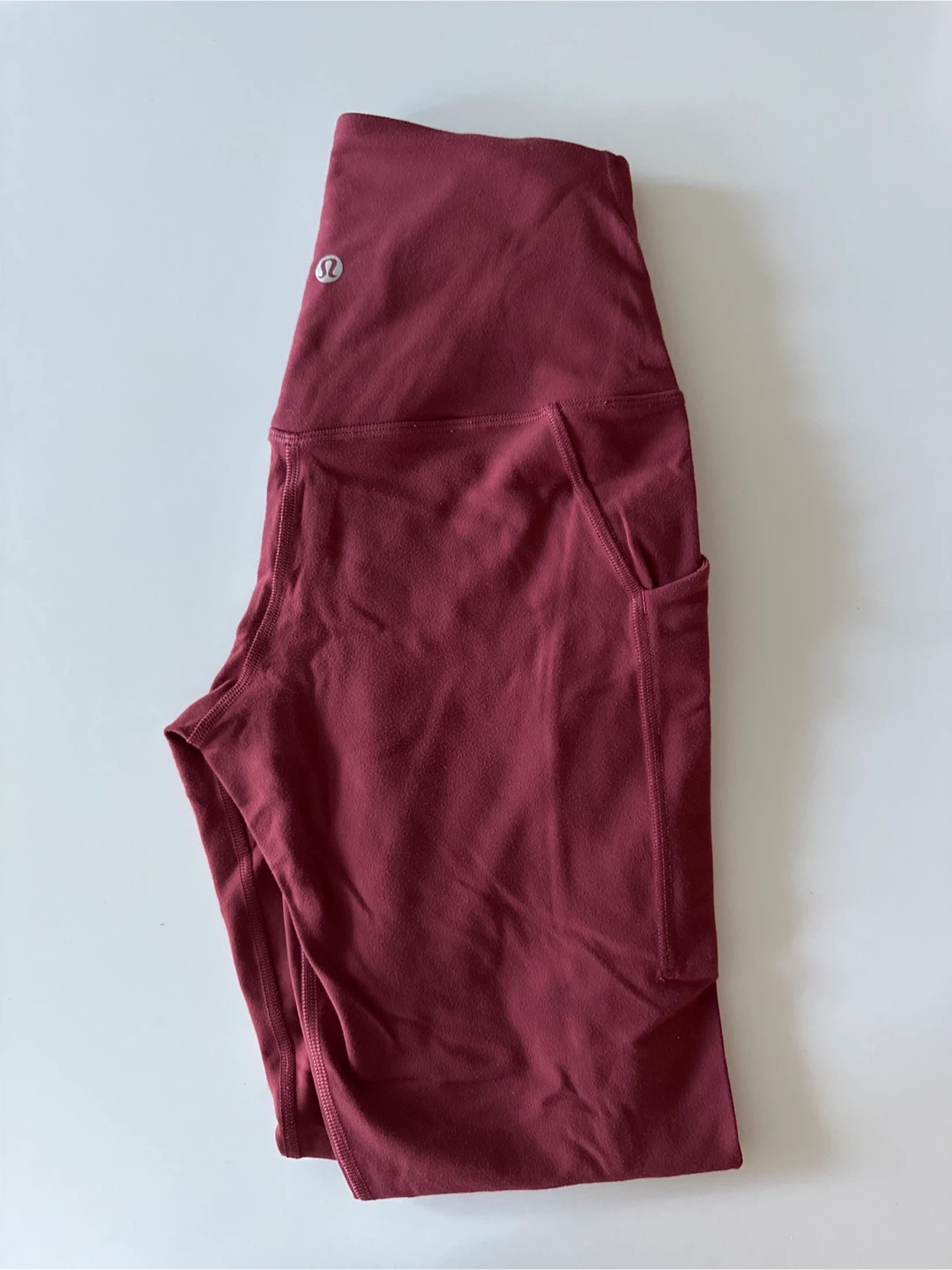 High-waisted Lululemon Align leggings in a deep berry colour. They feature side pockets and a comfortable, buttery-soft fabric. These leggings are perfect for yoga or everyday wear.