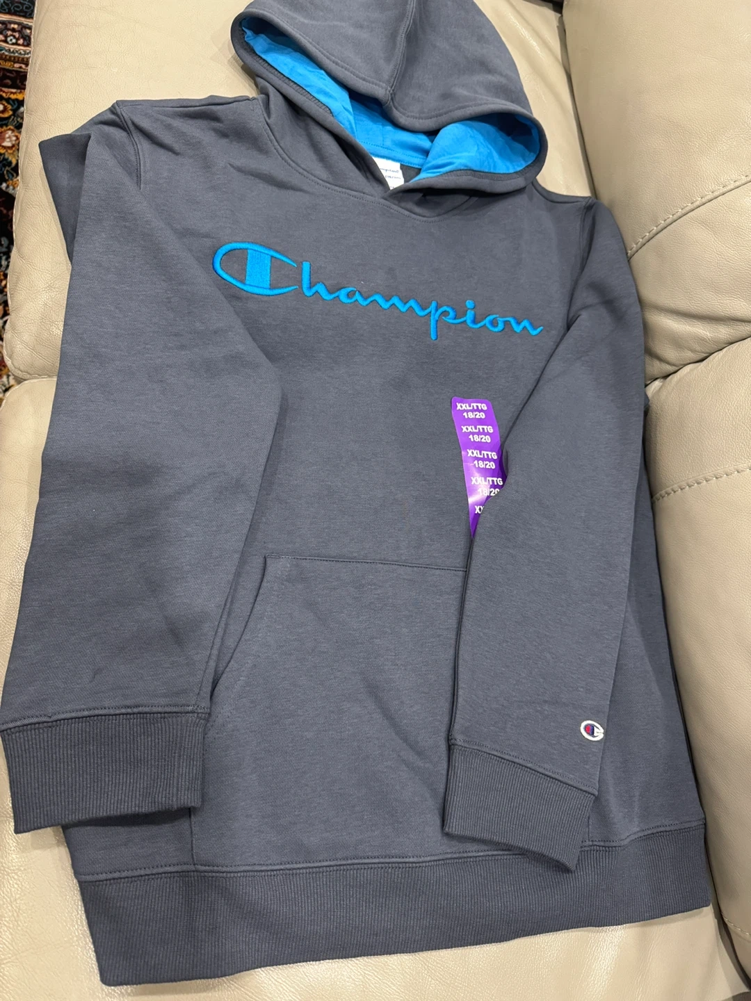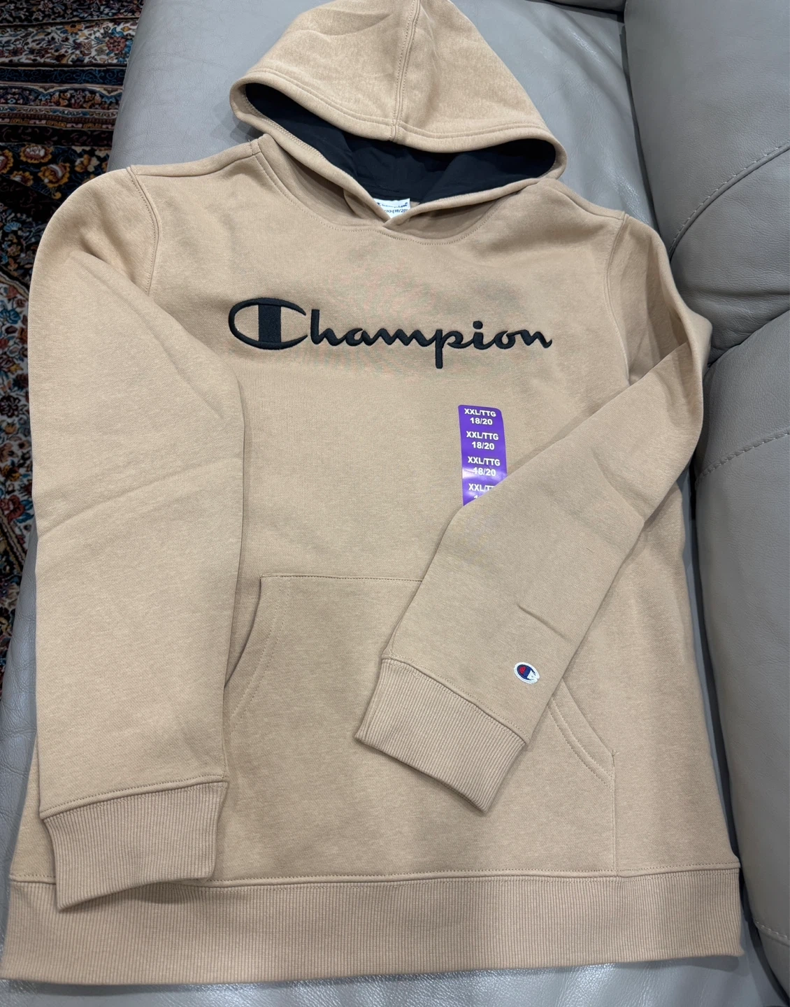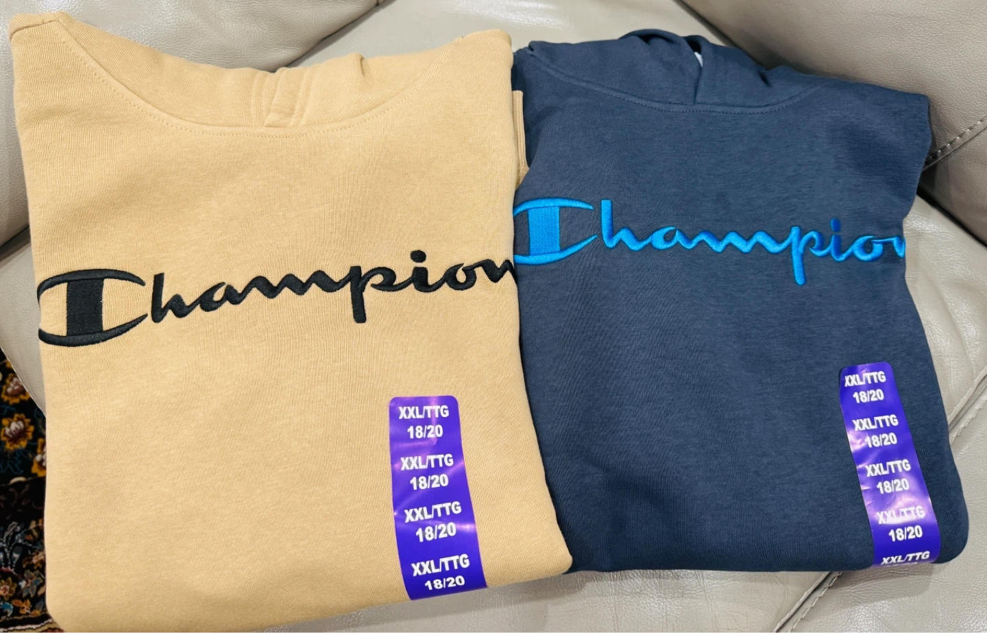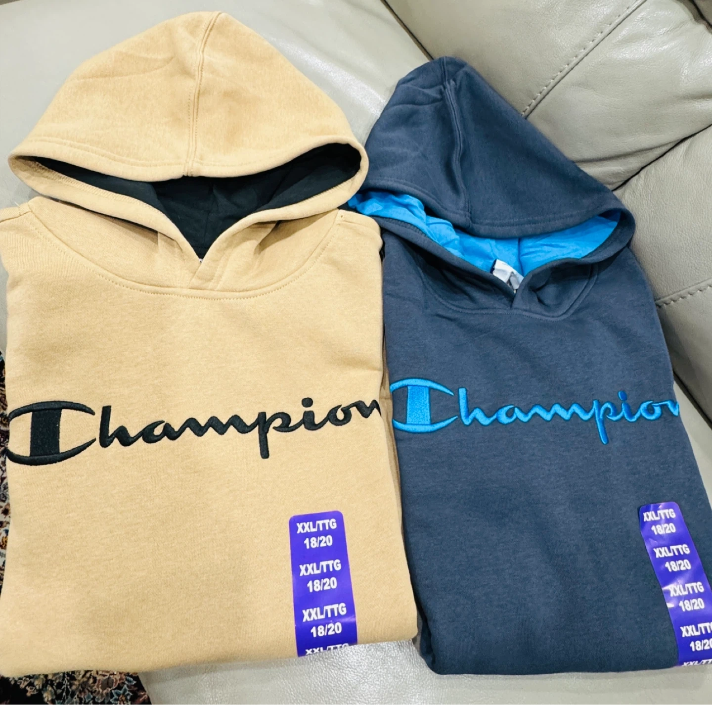 Brand New each $20, together both for $35 firm. Two Champion hoodies, one in tan and one in navy. Both are size XXL/TTG 18/20. They feature the Champion logo embroidered on the front. The navy hoodie has a bright blue embroidered logo and a contrasting blue hood lining. Pickup midland and Lawrence, Scarborough