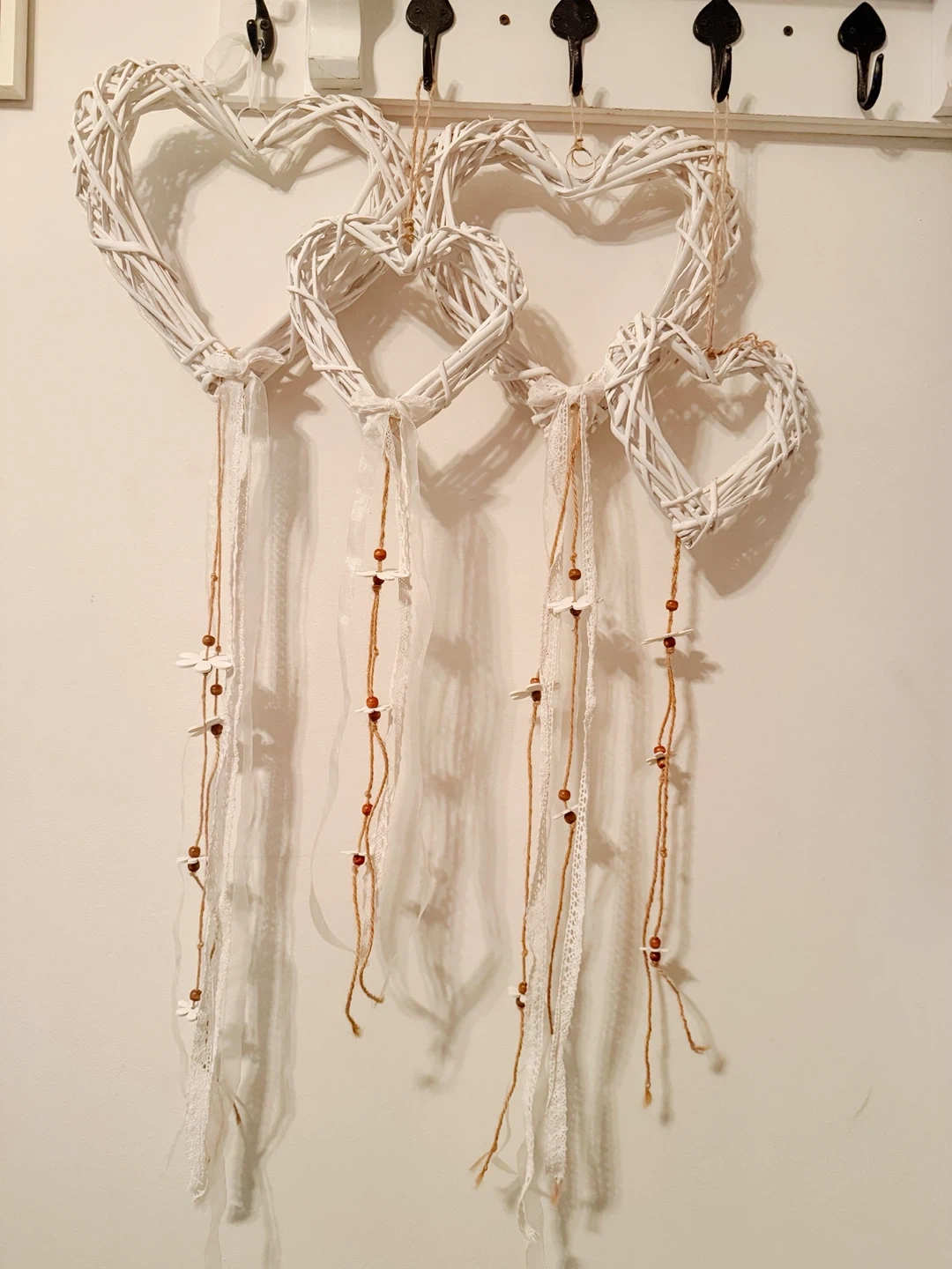 Each heart is adorned with dangling ribbons, lace, and twine accents, decorated with wooden beads and delicate flower shapes. It's a lovely piece for adding a touch of rustic charm to any room!