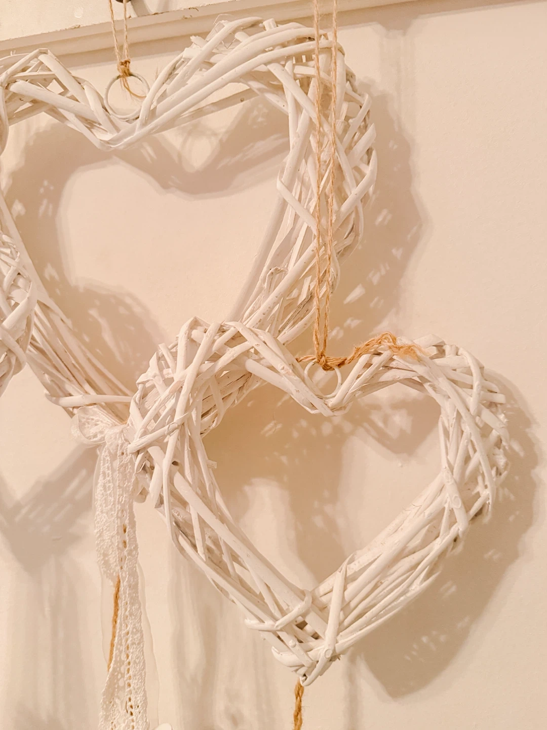 Each heart is adorned with dangling ribbons, lace, and twine accents, decorated with wooden beads and delicate flower shapes. It's a lovely piece for adding a touch of rustic charm to any room!