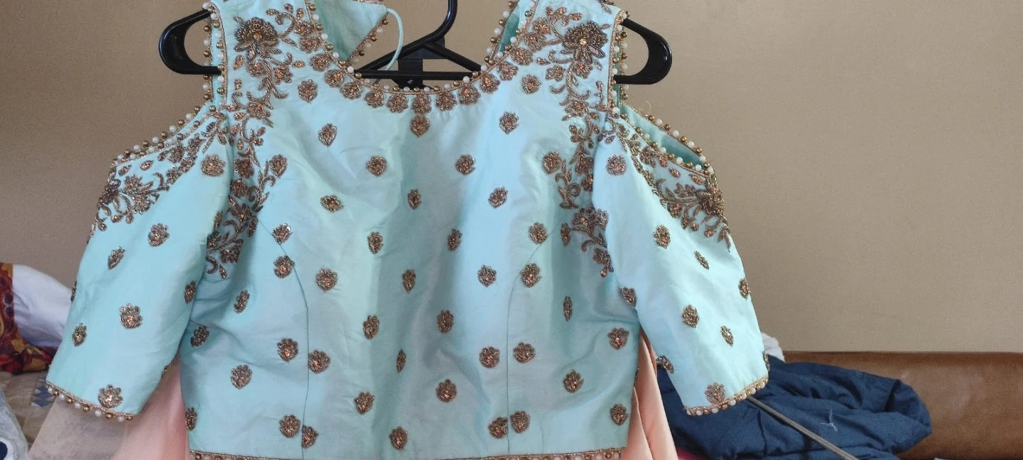 This light blue crop top features intricate gold and pearl beadwork, with stylish cold-shoulder sleeves. It's paired with a flowing pastel pink skirt with decorative gold and green trim. Perfect for festive occasions!