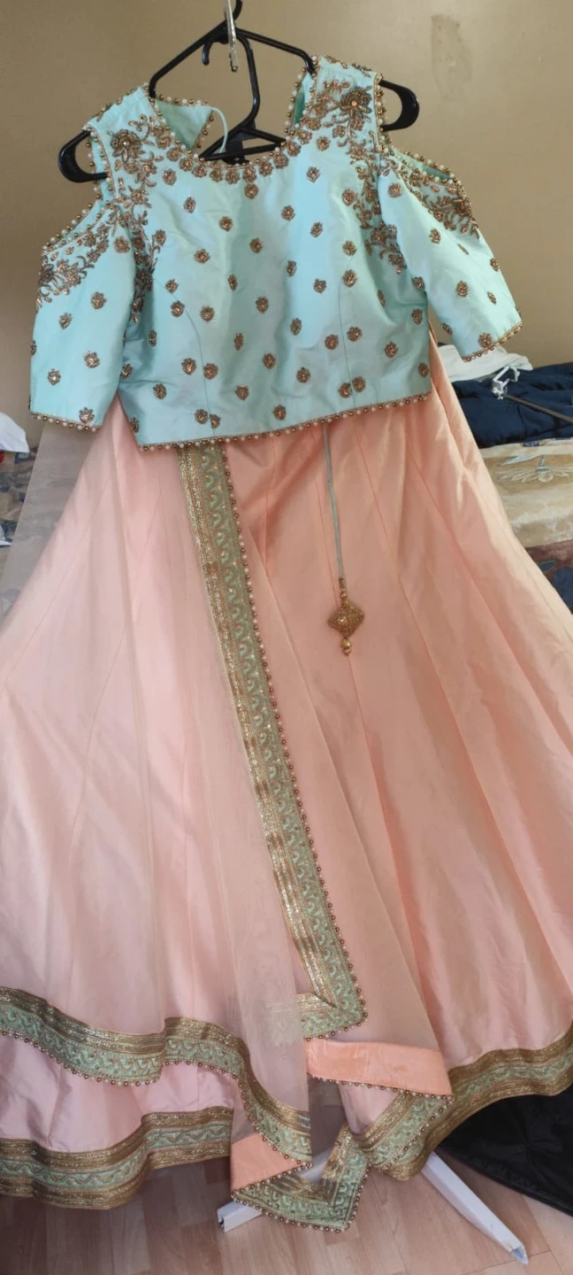 This light blue crop top features intricate gold and pearl beadwork, with stylish cold-shoulder sleeves. It's paired with a flowing pastel pink skirt with decorative gold and green trim. Perfect for festive occasions!