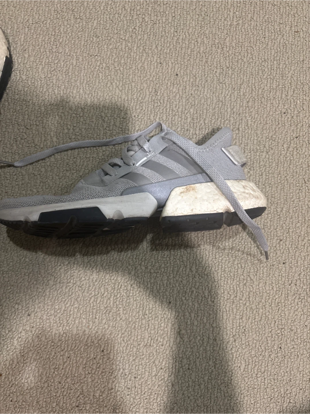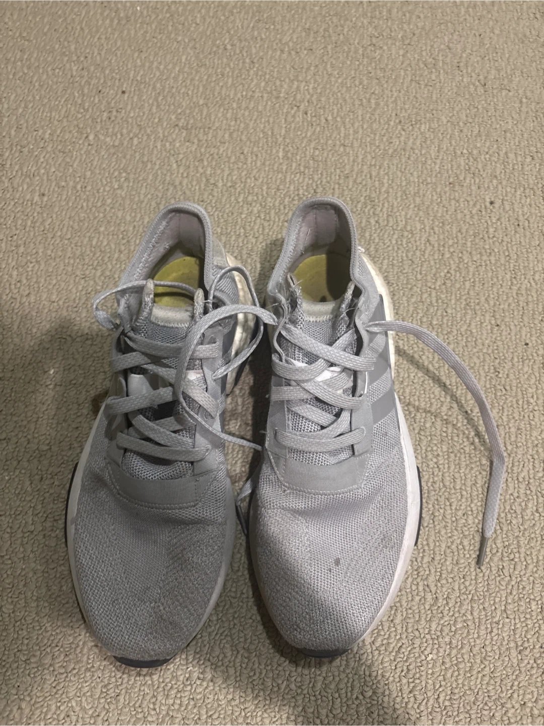 These are a pair of grey Adidas running shoes. They feature a mesh upper and a cushioned sole. Good for everyday wear or light athletic activities.