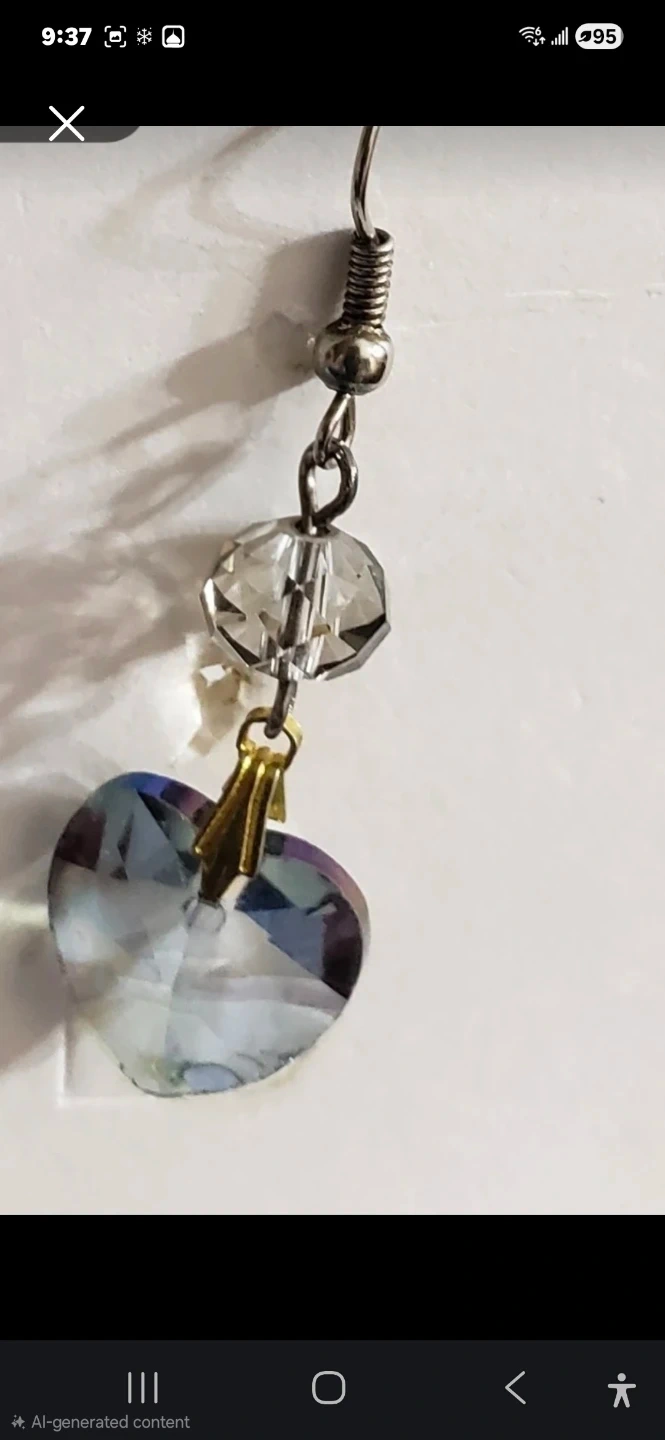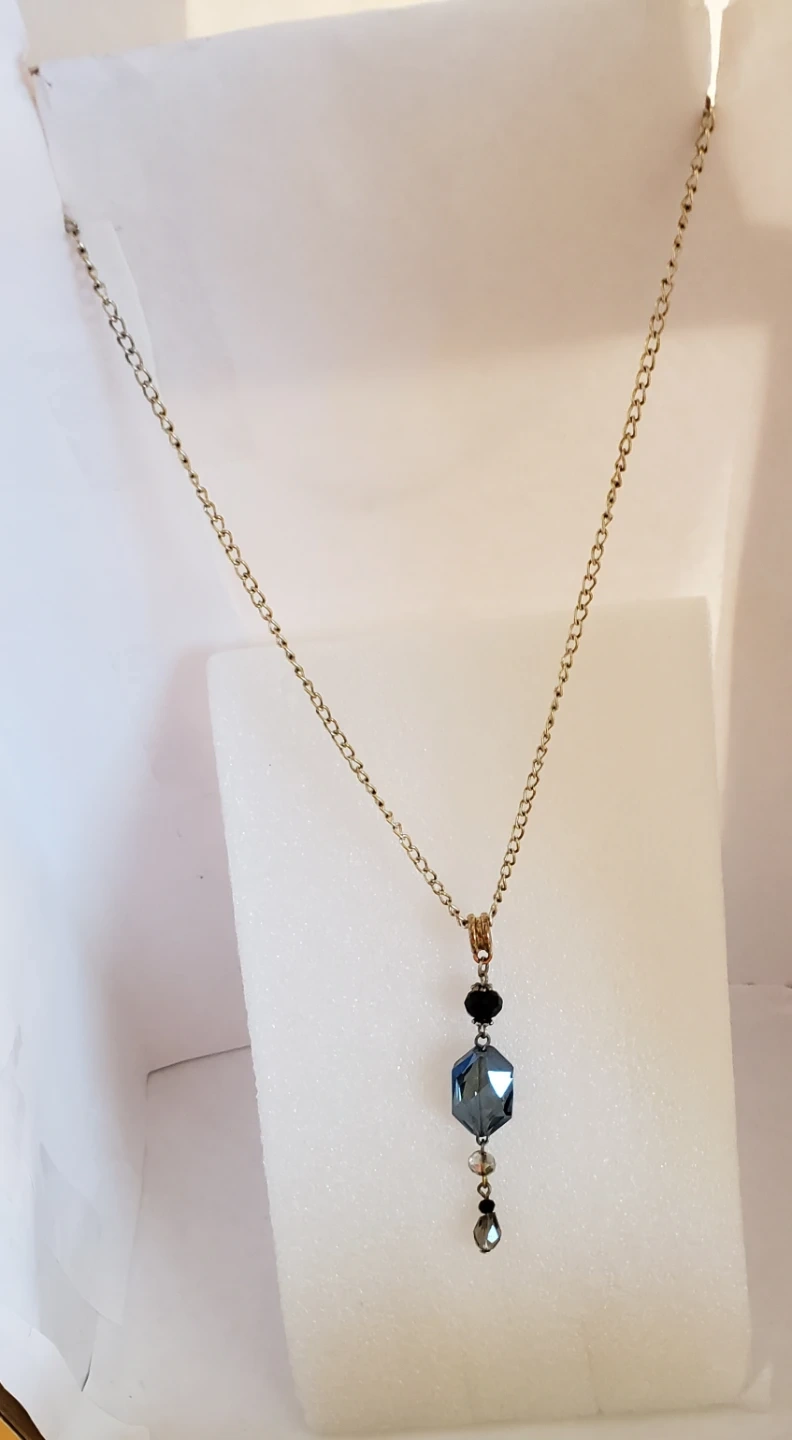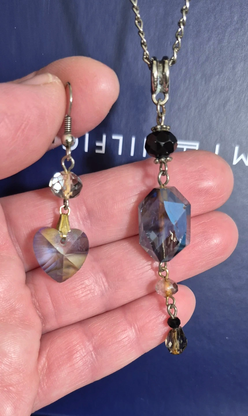 This set includes a necklace with a faceted blue hexagon pendant and matching earrings featuring heart-shaped charms. The jewellery is embellished with black and clear beads. It's a lovely accessory for everyday wear or special occasions!
