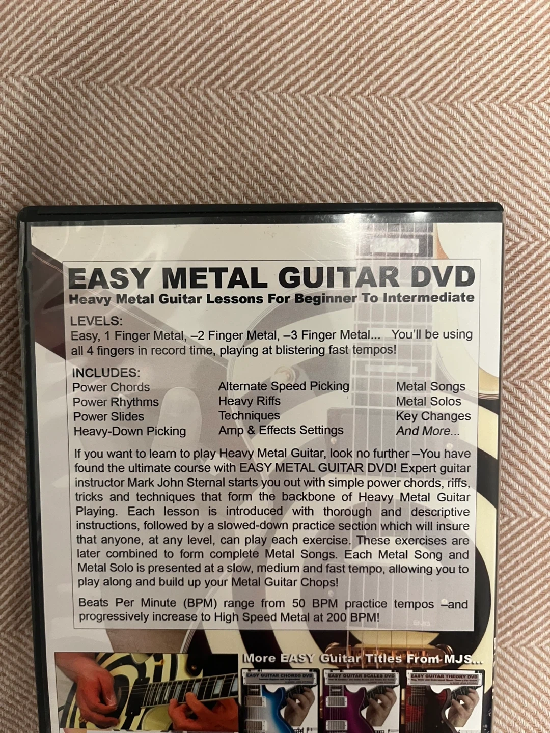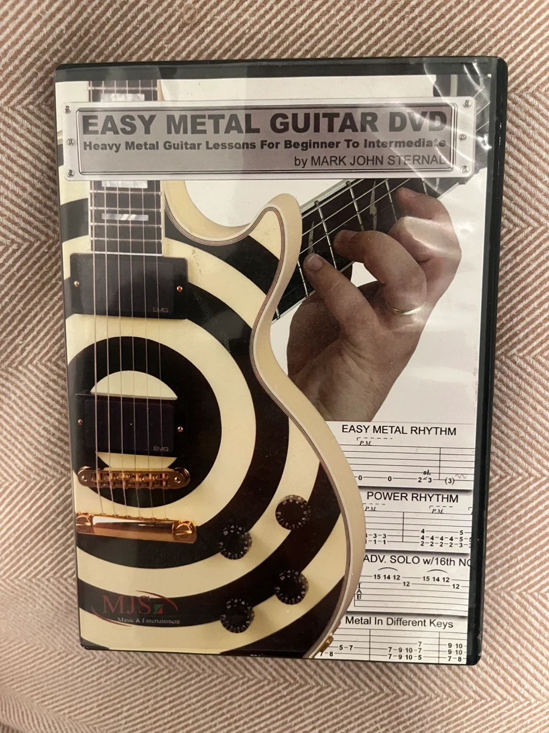 This DVD offers heavy metal guitar lessons for beginner to intermediate players. It covers power chords, power rhythms, power slides, and heavy-down picking. Expert instructor Mark John Sternal guides you through simple power chords, riffs, tricks, and techniques. It includes exercises for playing along and building your metal guitar chops!