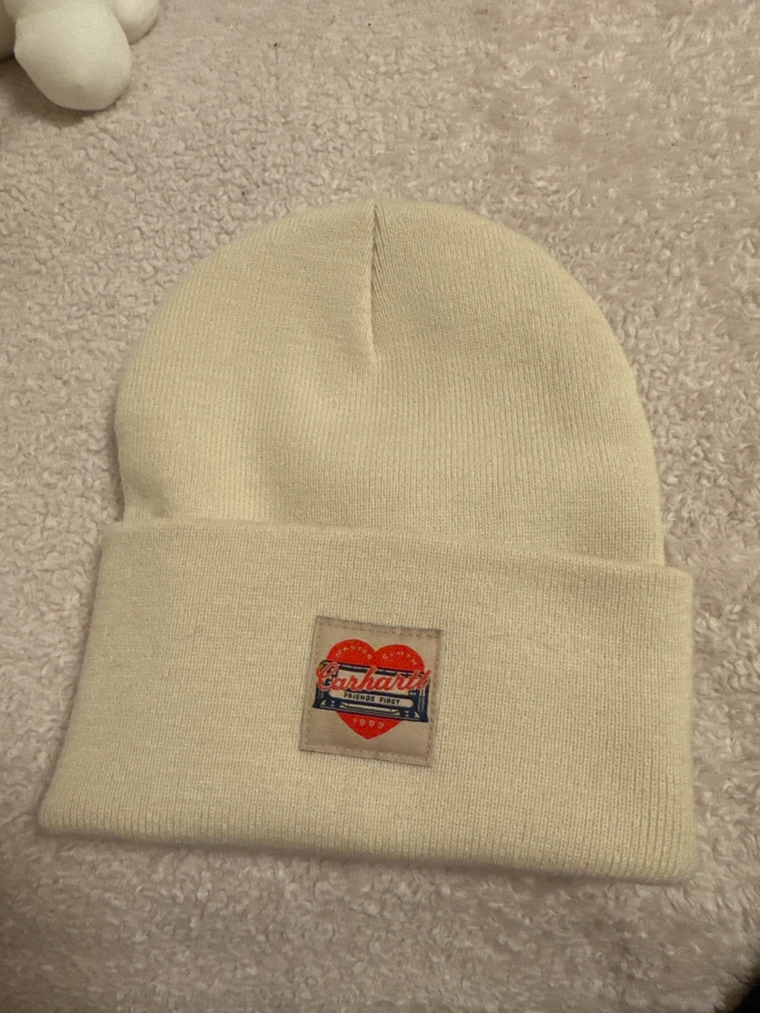 This is a cream-coloured Carhartt beanie. It features a patch with a heart and the Carhartt logo. It's made of knit material.