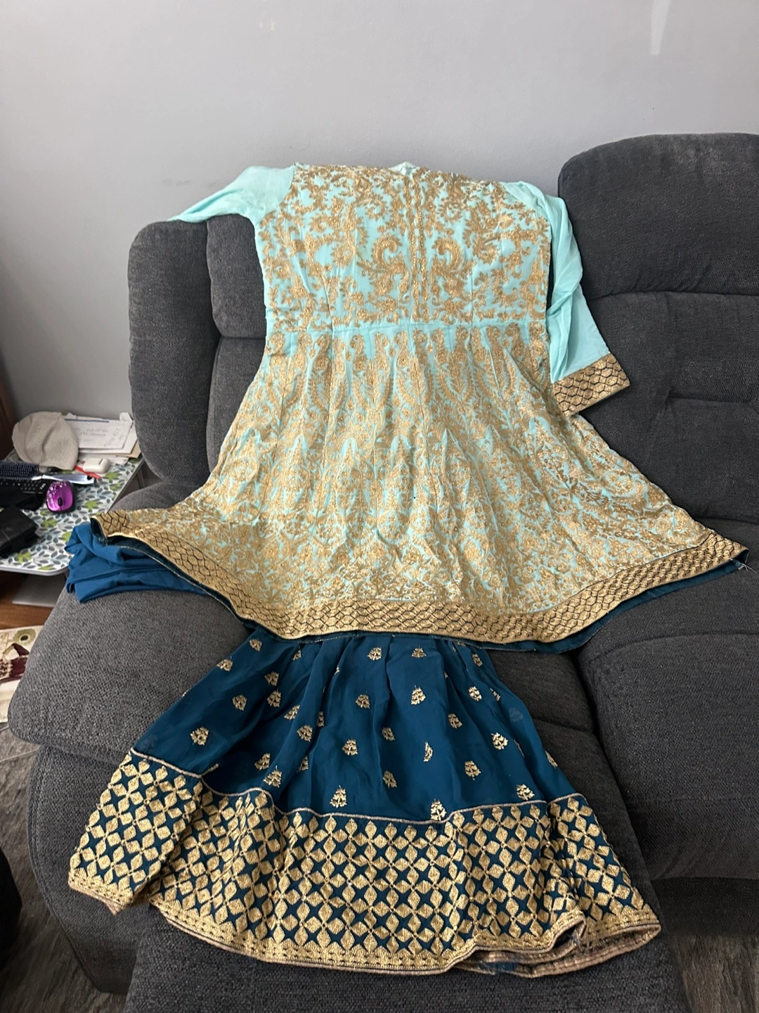 Gorgeous suit with ghararah. Features a mint top with gold embroidery and a teal skirt with gold detailing. Long sleeves. Elegant and stylish with dupatta in medium to large size. Only worn for a couple of hours. 75 cash pickup at Keele and eglinton