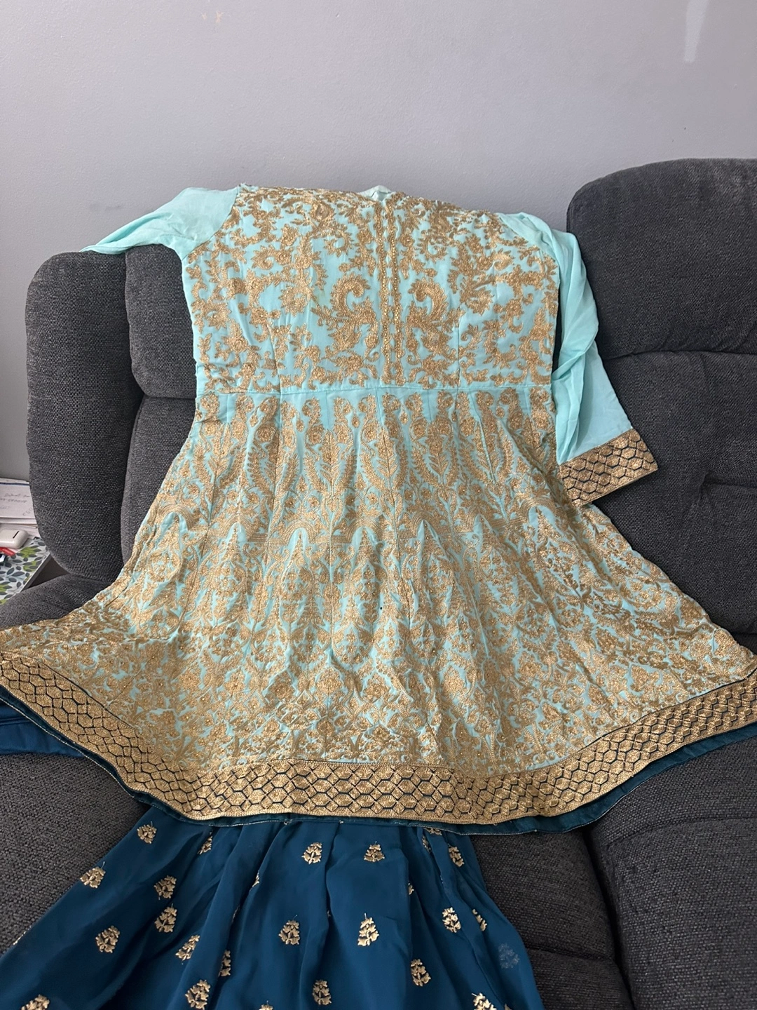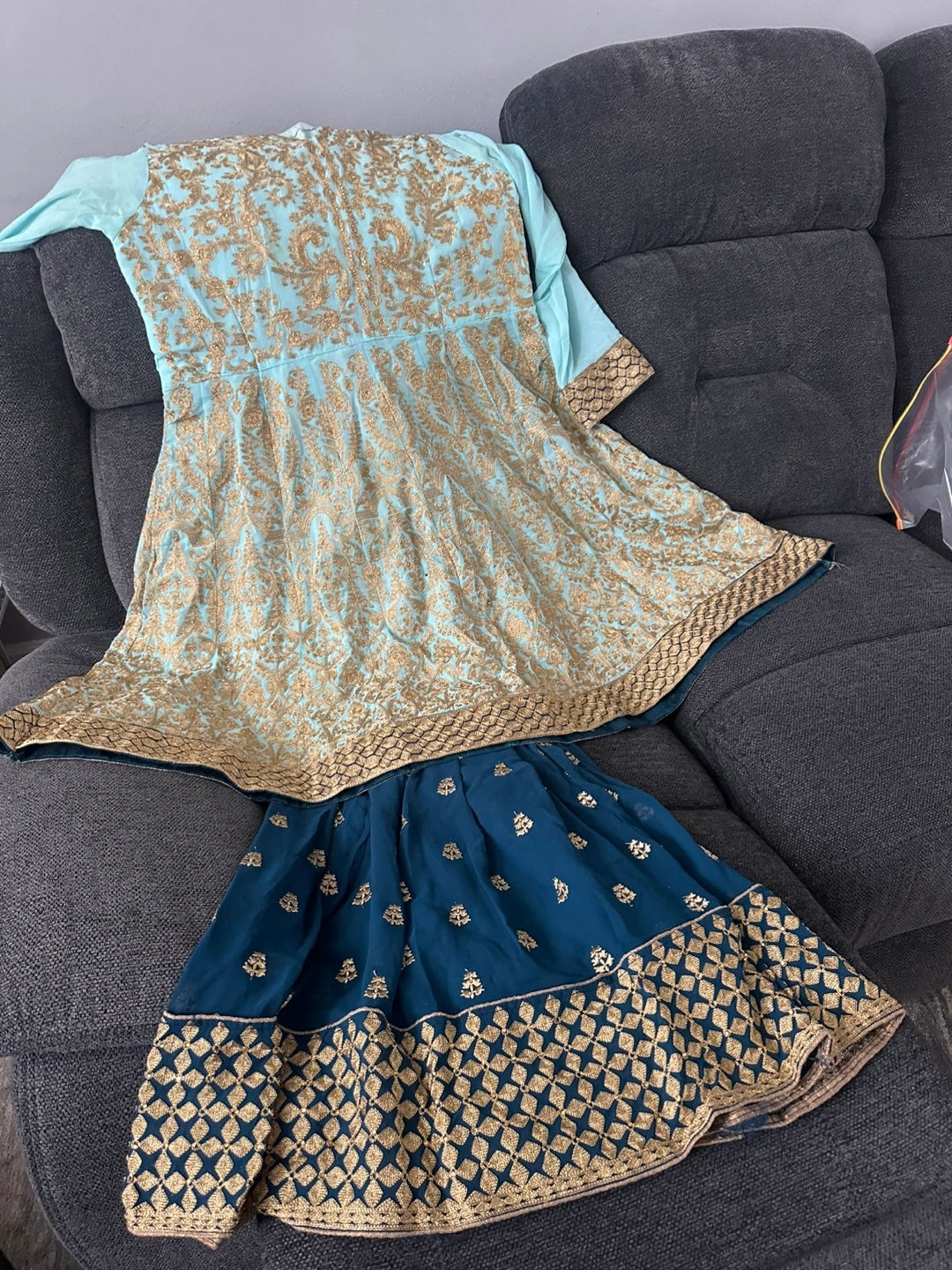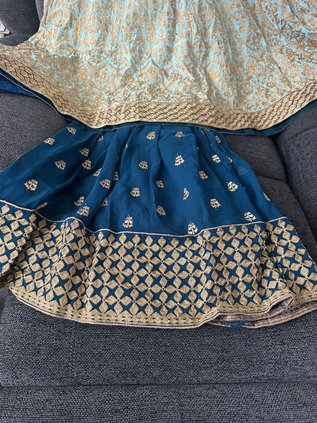 Gorgeous suit with ghararah. Features a mint top with gold embroidery and a teal skirt with gold detailing. Long sleeves. Elegant and stylish with dupatta in medium to large size. Only worn for a couple of hours. 75 cash pickup at Keele and eglinton