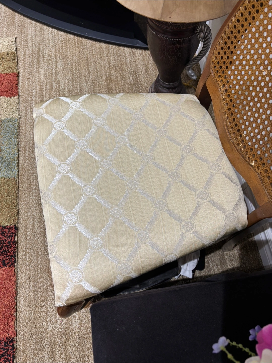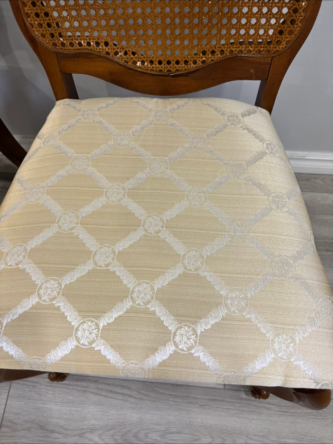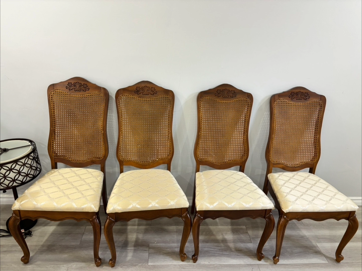 Selling a set of four vintage dining chairs. They feature a lovely rattan back and a patterned seat cushion. The chairs are in good condition and would add a touch of elegance to any dining room!