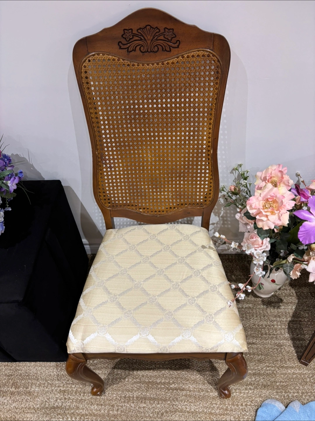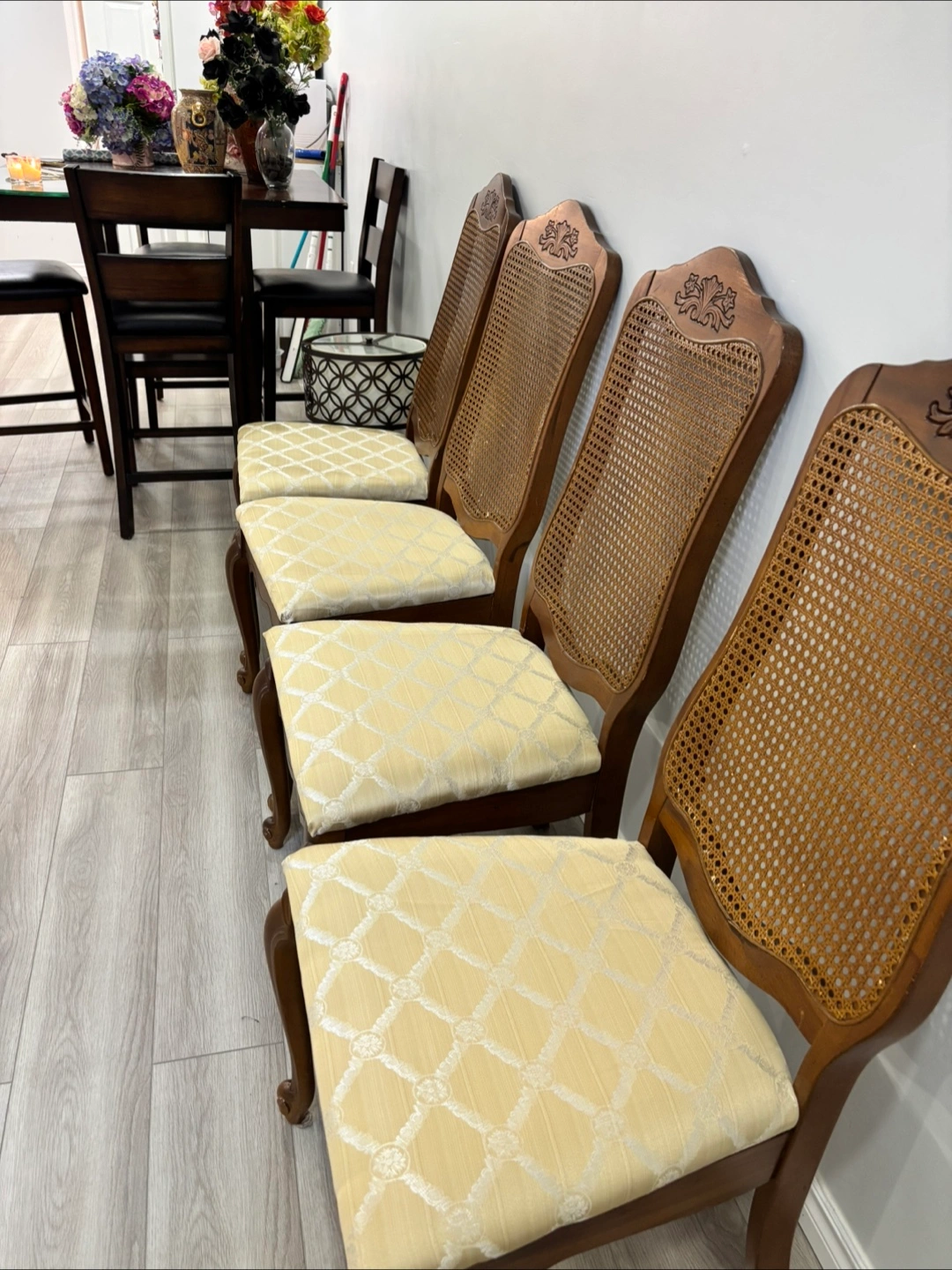 Selling a set of four vintage dining chairs. They feature a lovely rattan back and a patterned seat cushion. The chairs are in good condition and would add a touch of elegance to any dining room!