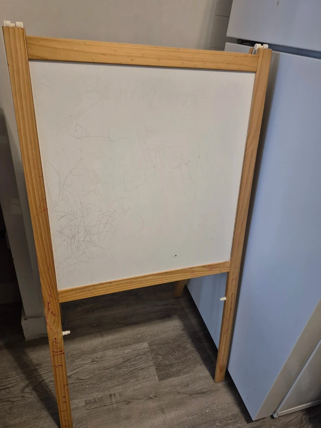 This is a wooden A-frame easel with a chalkboard on one side and a whiteboard on the other. It's a great item for kids' activities or as a display board. It's easy to fold for storage.
