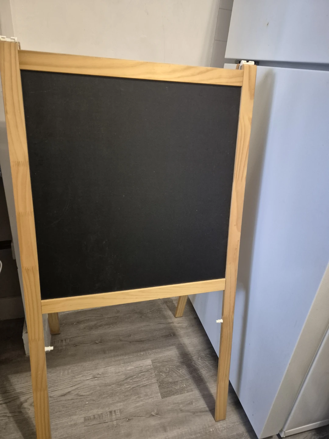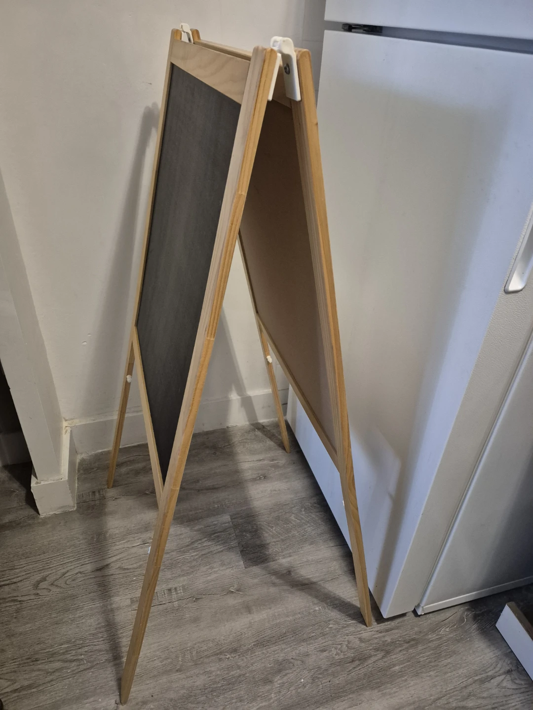 This is a wooden A-frame easel with a chalkboard on one side and a whiteboard on the other. It's a great item for kids' activities or as a display board. It's easy to fold for storage.