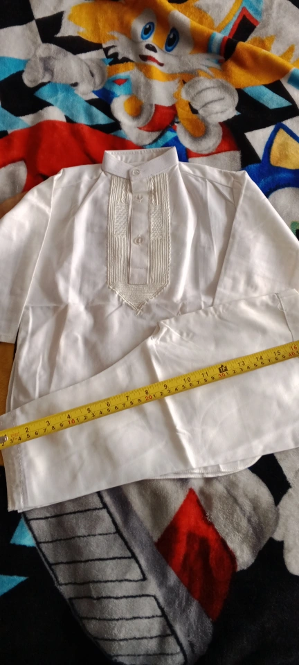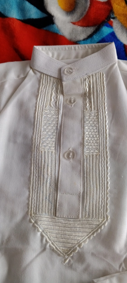 Adorable boys' kurta pajama set. White cotton fabric. Intricate white embroidery detail on the kurta. Long sleeves. Button closure. Size appears to be approximately 2T-3T (refer to measurements). Great for special occasions or everyday wear.