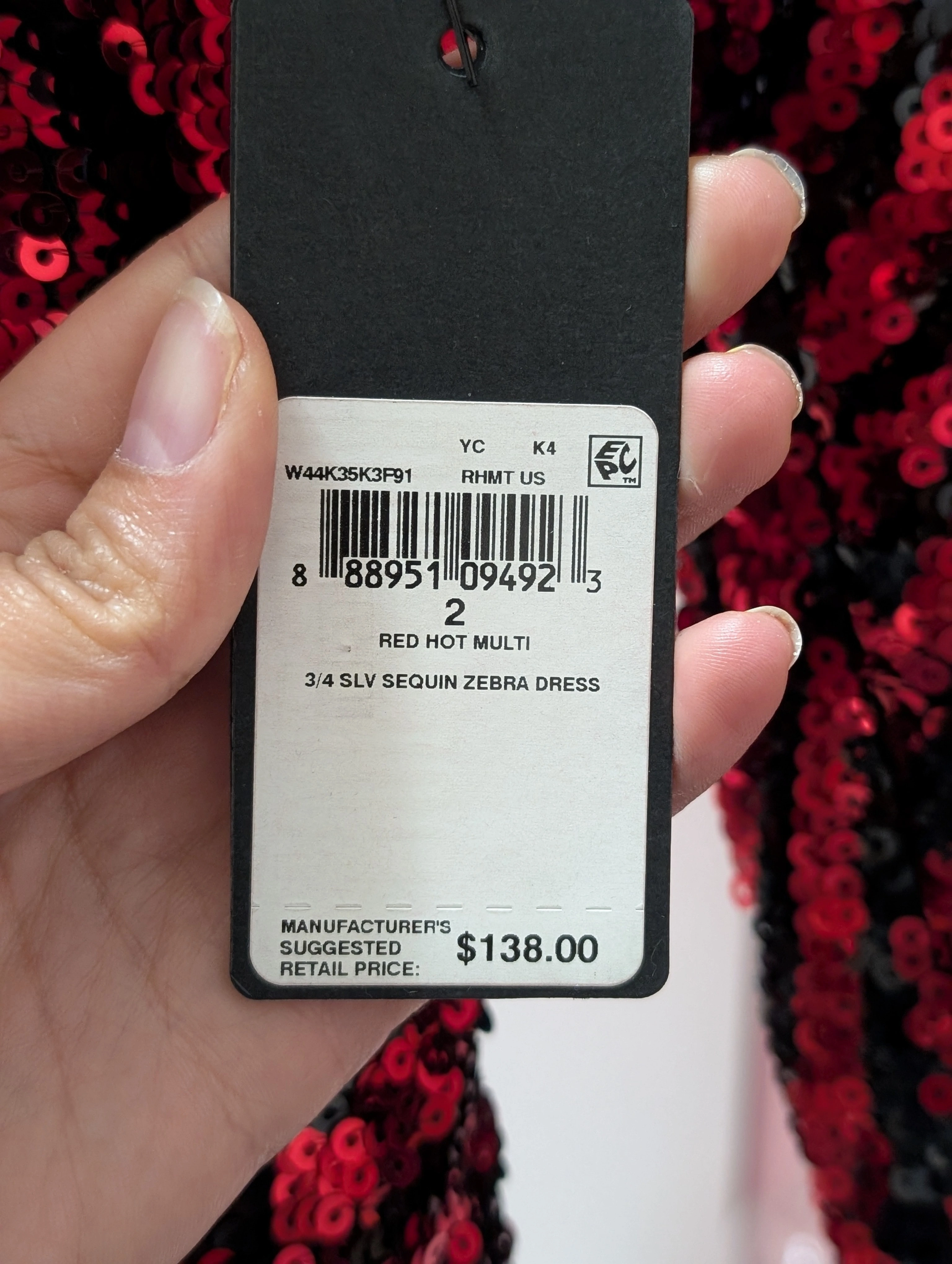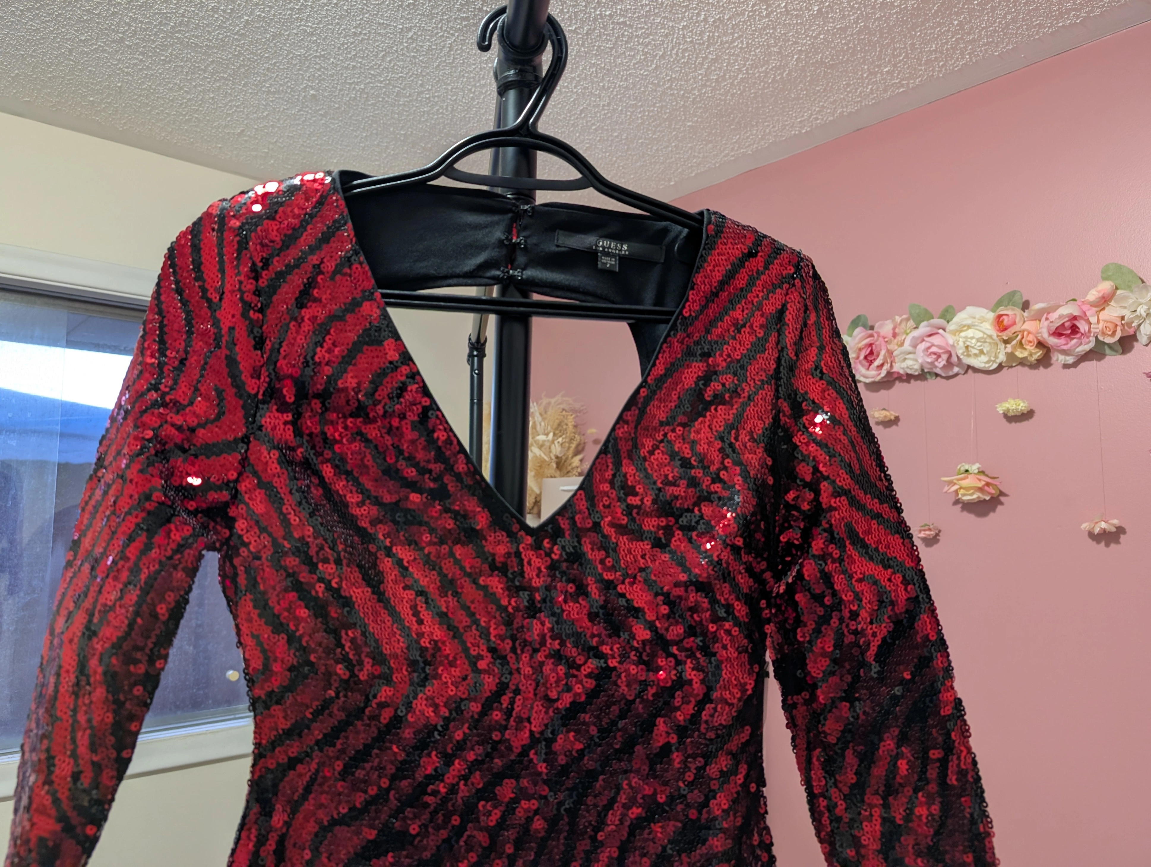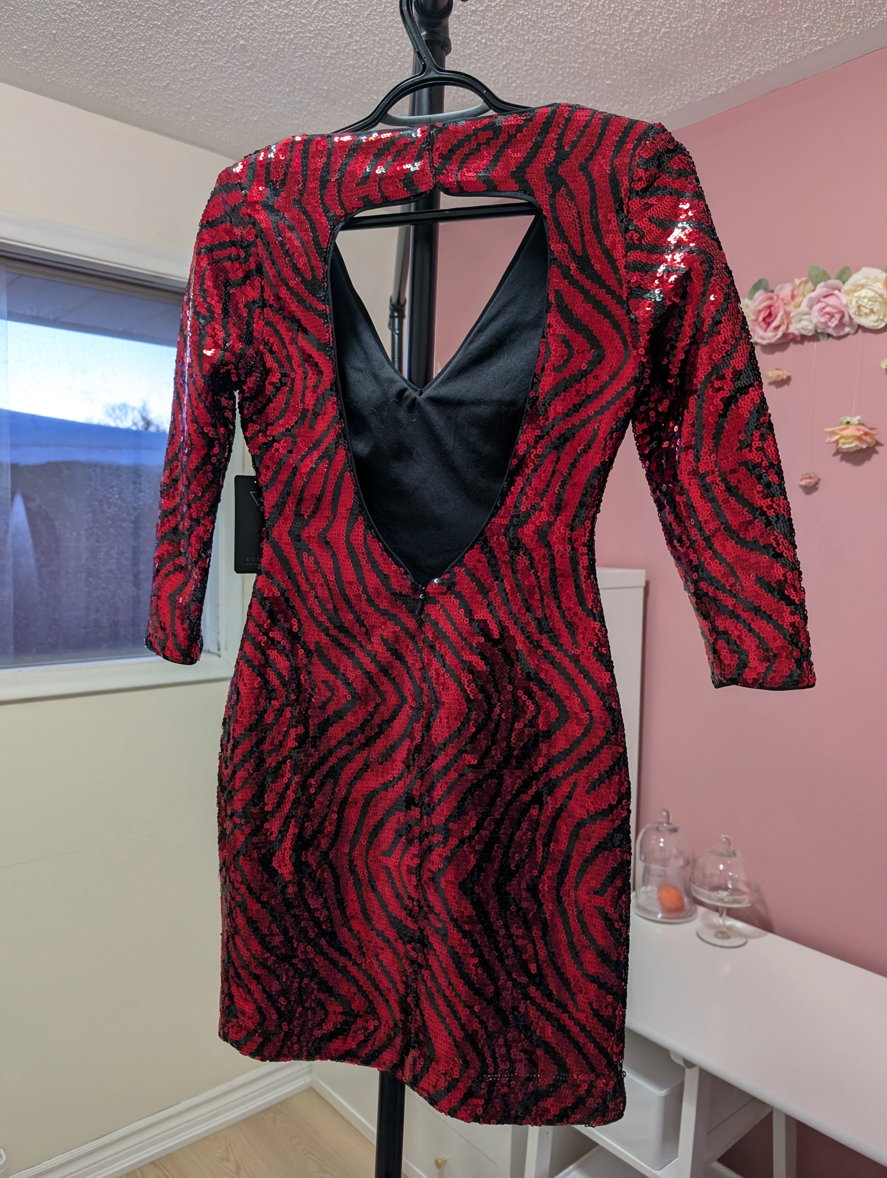Looking to sell this gorgeous GUESS dress! It features a striking red and black sequin pattern, perfect for a night out.