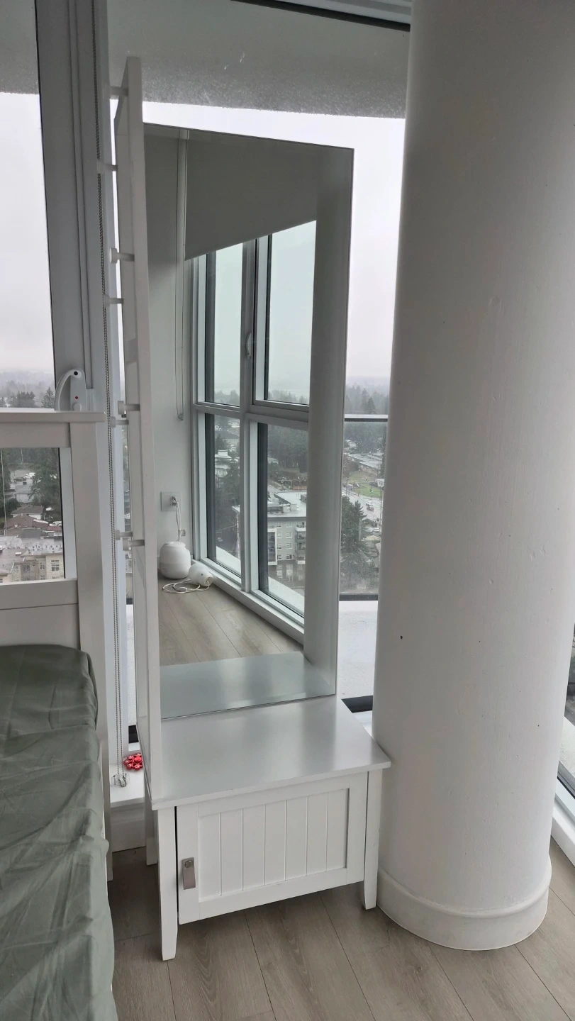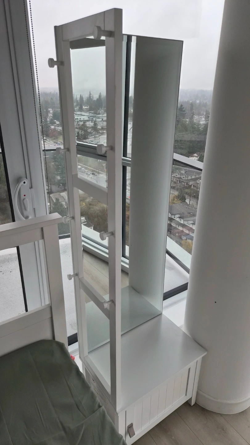 Selling a beautiful white full-length standing mirror with a built-in storage cabinet and convenient side knobs for hanging bags, scarves, hats, or accessories. Perfect for bedrooms, closets, entryways, or compact spaces.