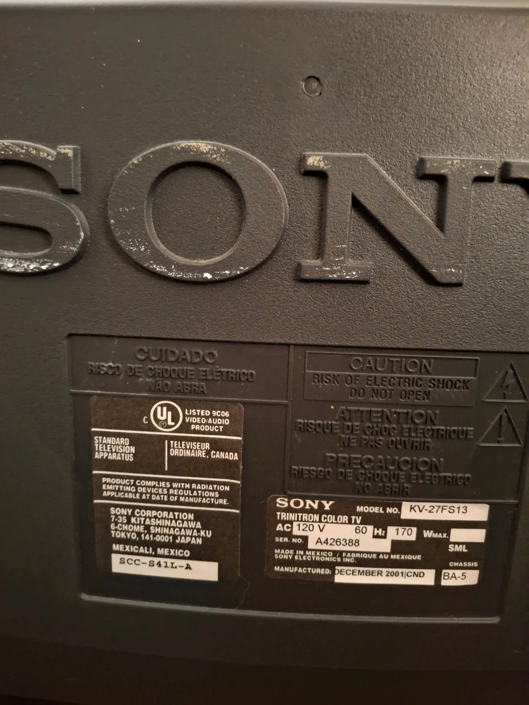 This Sony Trinitron television is a classic CRT model. It has S-Video and component inputs for versatile connectivity. Manufactured in December 2001.
