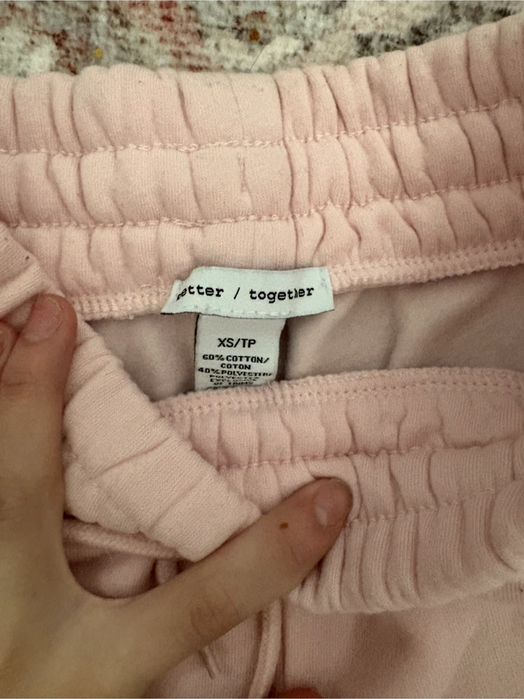 Selling a pair of Better Together sweatpants in size XS/TP. They're a lovely light pink colour and made of 60% cotton and 40% polyester. Perfect for lounging around the house or running errands!