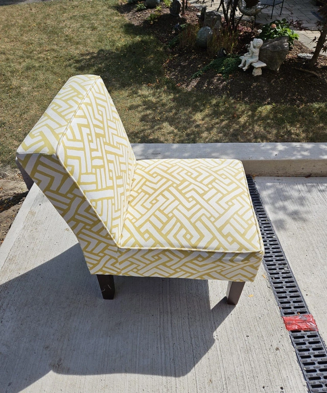 76Add a pop of colour and style to your living space with this chic accent chair! This chair features a modern geometric pattern in gold and white, making it a stylish addition to any room. This chair is in good condition and is ready to be enjoyed. * Colour: Gold and white * Style: Modern, Geometric * Legs: Dark brown, sturdy wood If this ad is still up, then yes, it's still available for purchase!