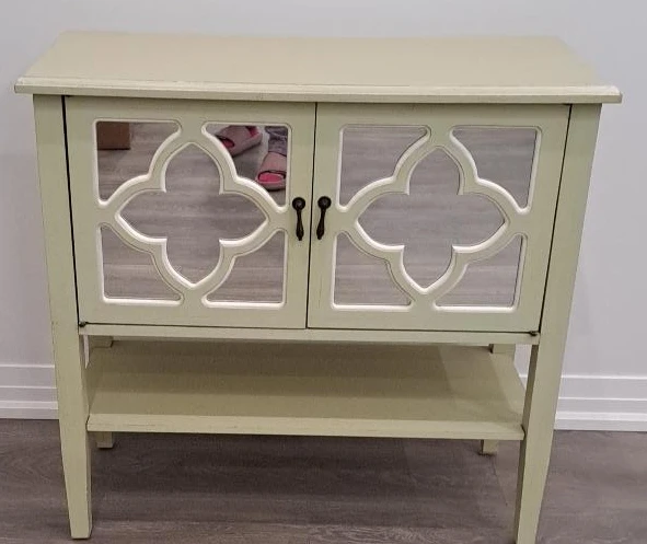 98This accent console table features mirrored doors and a light green finish. It's perfect as a decorative piece or for extra storage in your living room or entryway. It has a shelf at the bottom for additional space.