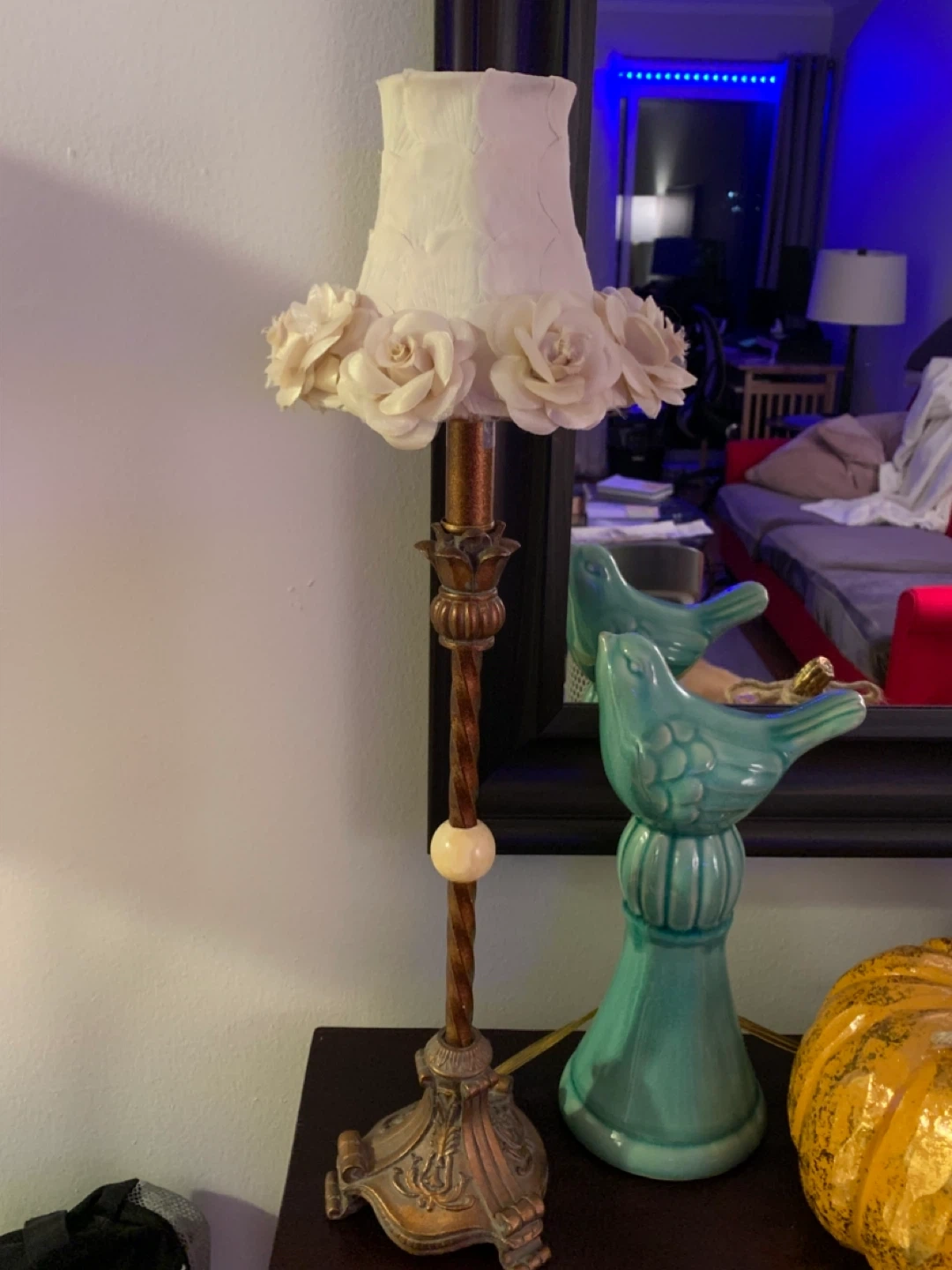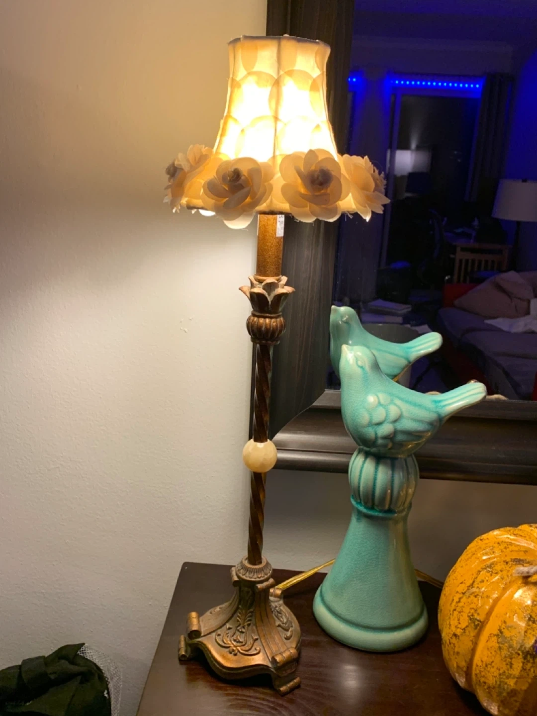 Add a touch of elegance to any room with this charming floral accent table lamp! The lamp features a unique design with delicate floral accents around the shade. It's perfect for adding a warm and inviting glow to your bedside table, living room, or any space that needs a little extra charm. 21.5” tall