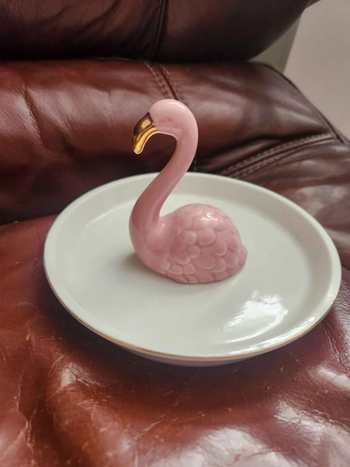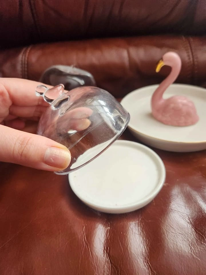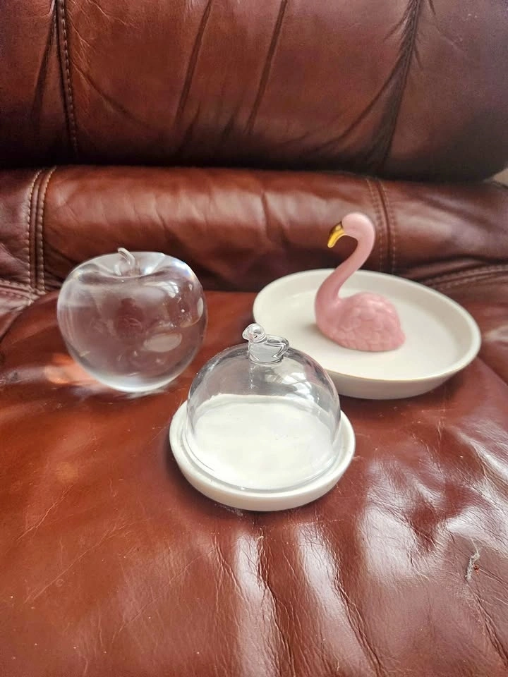 • Small flamingo dish, glass bird dome covered dish, glass apple
