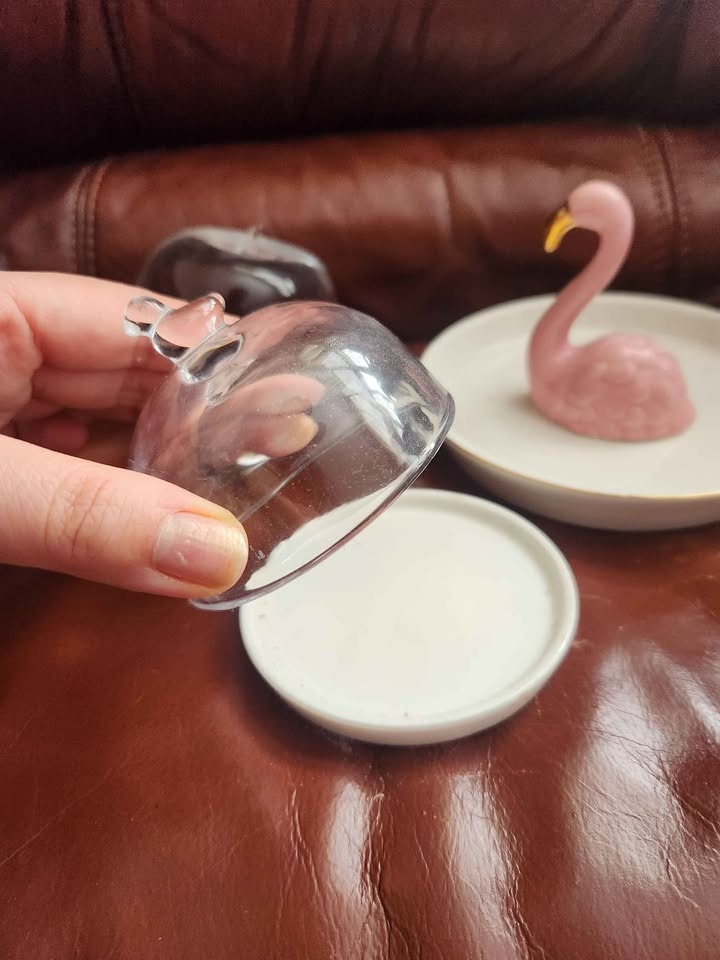 • Small flamingo dish, glass bird dome covered dish, glass apple