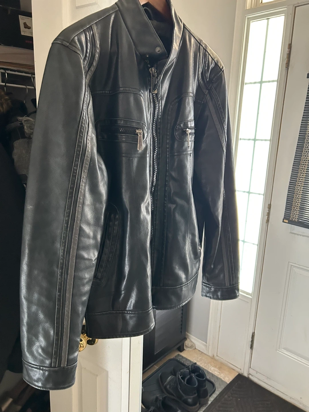 This black faux leather jacket features a zip-up front with multiple zippered pockets. It has a stand-up collar and stylish seam detailing on the sleeves. A great jacket for cooler weather!