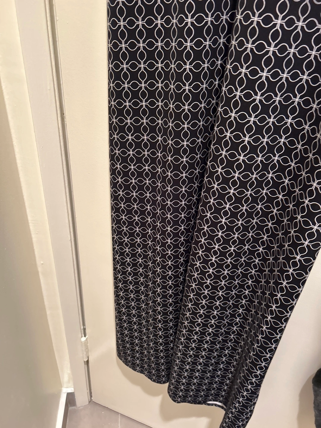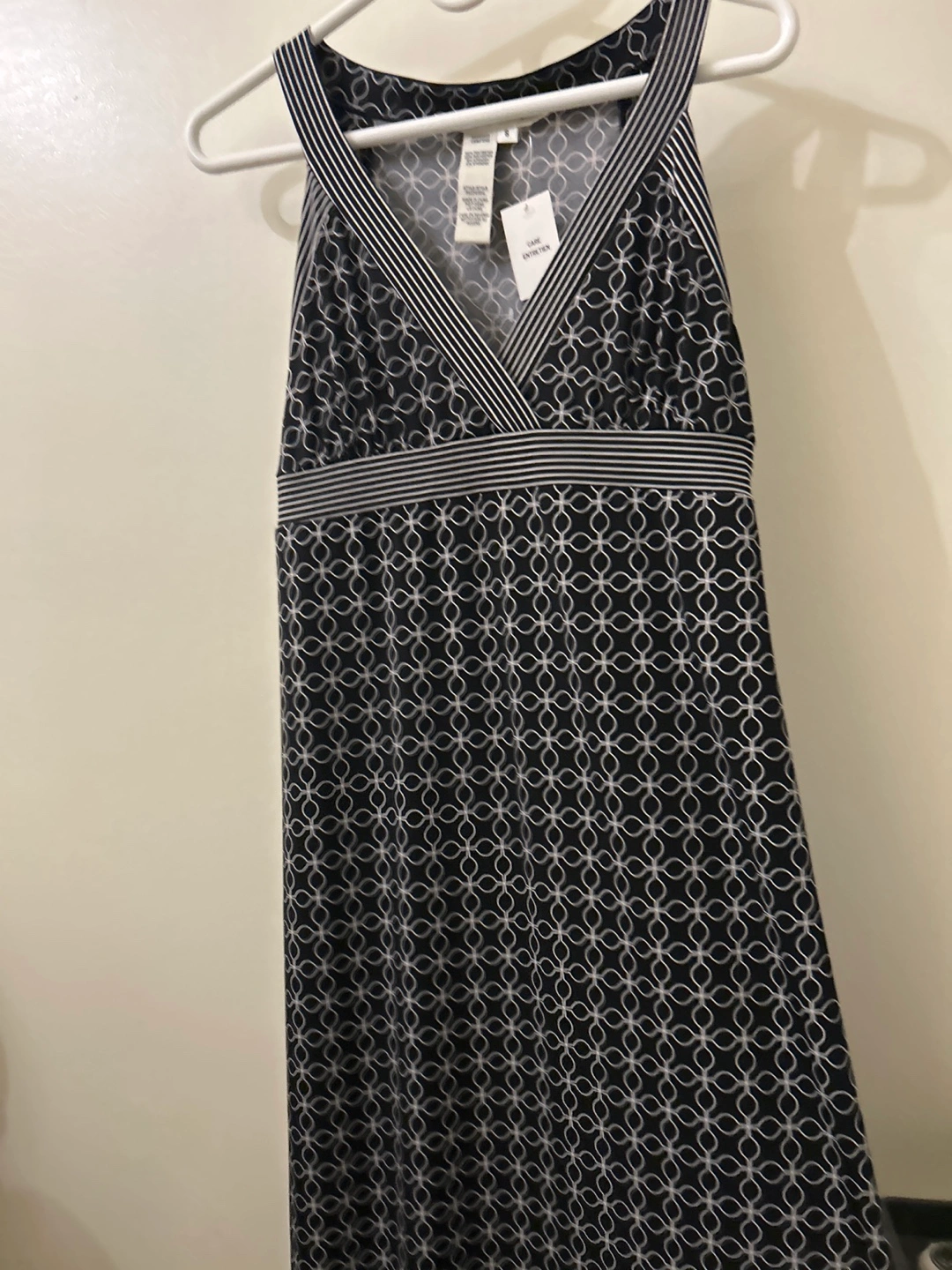 This MAX STUDIO maxi dress features a black and white geometric pattern. It's made of 95% polyester and 5% spandex. The size is small.