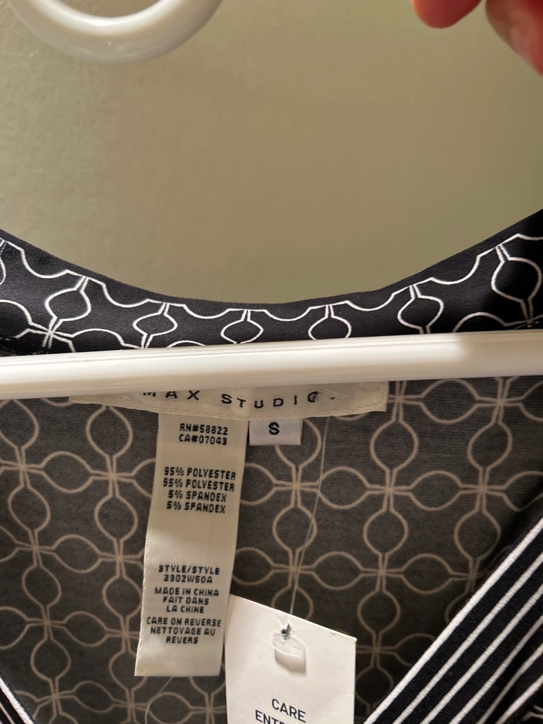 This MAX STUDIO maxi dress features a black and white geometric pattern. It's made of 95% polyester and 5% spandex. The size is small.