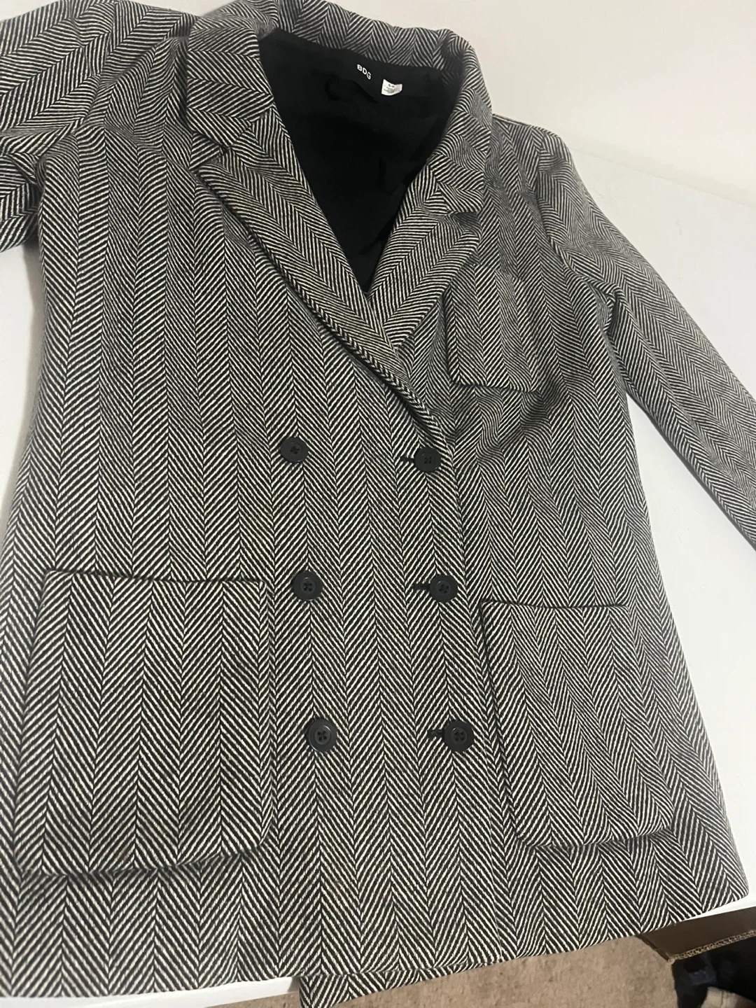 Selling a stylish BDG blazer in a classic herringbone pattern! It's a size small and features a double-breasted design. Perfect for adding a touch of sophistication to any outfit